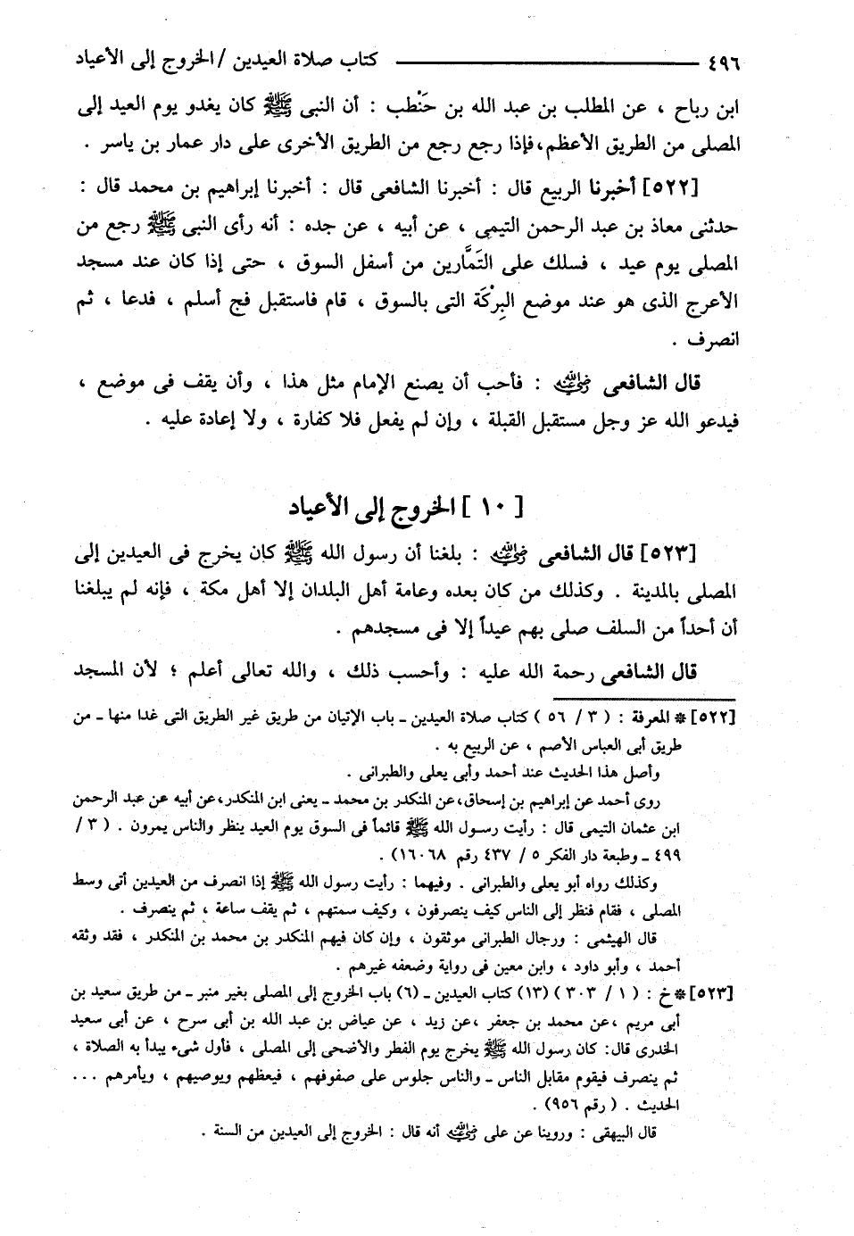 ابْنُ رَبَاحٍ عَنْ الْمُطَّلِبِ بْنِ عَبْدِ اللَّهِ بْنِ حَنْطَبٍ { أَنَّ النَّبِيَّ - صلى الله عليه وسلم - كَانَ يَغْدُو يَوْمَ الْعِيدِ إلَى الْمُصَلَّى مِنْ الطَّرِيقِ الْأَعْظَمِ فَإِذَا رَجَعَ رَجَعَ مِنْ الطَّرِيقِ الْأُخْرَى عَلَى دَارِ عَمَّارِ بْنِ يَاسِرٍ } أَخْبَرَنَا الرَّبِيعُ قَالَ أَخْبَرَنَا الشَّافِعِيُّ قَالَ أَخْبَرَنَا إبْرَاهِيمُ بْنُ مُحَمَّدٍ قَالَ حَدَّثَنِي { مُعَاذُ بْنُ عَبْدِ الرَّحْمَنِ التَّيْمِيُّ عَنْ أَبِيهِ عَنْ جَدِّهِ أَنَّهُ رَأَى النَّبِيَّ - صلى الله عليه وسلم - رَجَعَ مِنْ الْمُصَلَّى يَوْمَ عِيدٍ فَسَلَكَ عَلَى التَّمَّارِينَ مِنْ أَسْفَلِ السُّوقِ حَتَّى إذَا كَانَ عِنْدَ مَسْجِدِ الْأَعْرَجِ الَّذِي هُوَ عِنْدَ مَوْضِعِ الْبَرَكَةِ الَّتِي بِالسُّوقِ قَامَ فَاسْتَقْبَلَ فَجَّ أَسْلَمَ فَدَعَا ثُمَّ انْصَرَفَ }
