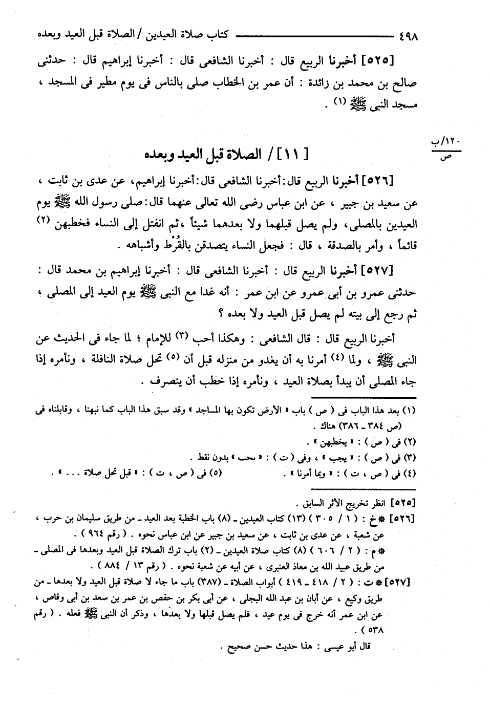 الصَّلاَةُ قَبْلَ الْعِيدِ وَبَعْدَهُ أَخْبَرَنَا الرَّبِيعُ قَالَ أَخْبَرَنَا الشَّافِعِيُّ قَالَ أَخْبَرَنَا إبْرَاهِيمُ عَنْ عَدِيِّ بْنِ ثَابِتٍ عَنْ سَعِيدِ بْنِ جُبَيْرٍ عَنْ ابْنِ عَبَّاسٍ رضي الله تعالى عنهما قَالَ { صَلَّى رَسُولُ اللَّهِ - صلى الله عليه وسلم - يَوْمَ الْعِيدَيْنِ بِالْمُصَلَّى , وَلَمْ يُصَلِّ قَبْلَهُمَا , وَلاَ بَعْدَهُمَا شَيْئًا ثُمَّ انْفَتَلَ إلَى النِّسَاءِ فَخَطَبَهُنَّ قَائِمًا , وَأَمَرَ بِالصَّدَقَةِ قَالَ : فَجَعَلَ النِّسَاءُ يَتَصَدَّقْنَ بِالْقُرْطِ وَأَشْبَاهِهِ } أَخْبَرَنَا الرَّبِيعُ قَالَ أَخْبَرَنَا الشَّافِعِيُّ قَالَ أَخْبَرَنَا إبْرَاهِيمُ بْنُ مُحَمَّدٍ قَالَ حَدَّثَنِي عَمْرُو بْنُ أَبِي عَمْرٍو { عَنْ ابْنِ عُمَرَ أَنَّهُ غَدَا مَعَ النَّبِيِّ - صلى الله عليه وسلم - يَوْمَ الْعِيدِ إلَى الْمُصَلَّى ثُمَّ رَجَعَ إلَى بَيْتِهِ لَمْ يُصَلِّ قَبْلَ الْعِيدِ وَلاَ بَعْدَهُ } , أَخْبَرَنَا الرَّبِيعُ قَالَ : قَالَ الشَّافِعِيُّ : وَهَكَذَا أُحِبُّ لِلْإِمَامِ لِمَا جَاءَ فِي الْحَدِيثِ عَنْ النَّبِيِّ - صلى الله عليه وسلم - , وَلِمَا أَمَرَنَا بِهِ أَنْ يَغْدُوَ مِنْ مَنْزِلِهِ قَبْلَ أَنْ تَحِلَّ صَلاَةُ النَّافِلَةِ وَنَأْمُرُهُ إذَا جَاءَ الْمُصَلَّى أَنْ يَبْدَأَ بِصَلاَةِ الْعِيدِ وَنَأْمُرُهُ إذَا خَطَبَ أَنْ يَنْصَرِفَ@