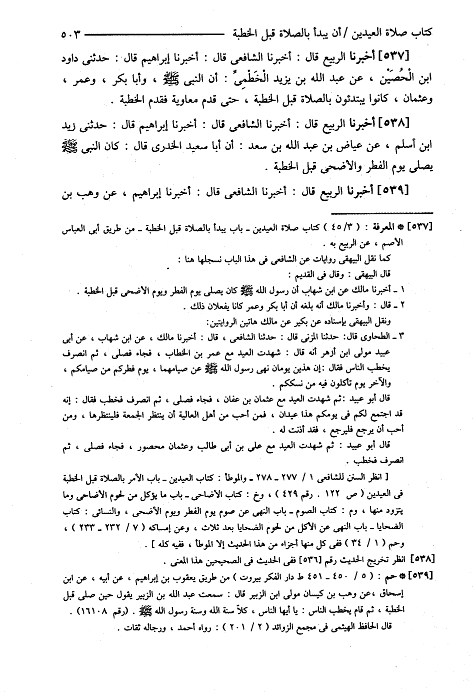 أَخْبَرَنَا الرَّبِيعُ قَالَ أَخْبَرَنَا الشَّافِعِيُّ قَالَ أَخْبَرَنَا إبْرَاهِيمُ قَالَ حَدَّثَنِي دَاوُد بْنُ الْحُصَيْنِ عَنْ عَبْدِ اللَّهِ بْنِ يَزِيدَ الْخِطْمِيِّ { أَنَّ النَّبِيَّ - صلى الله عليه وسلم - وَأَبَا بَكْرٍ وَعُمَرَ وَعُثْمَانَ كَانُوا يَبْتَدِئُونَ بِالصَّلاَةِ قَبْلَ الْخُطْبَةِ حَتَّى قَدِمَ مُعَاوِيَةُ فَقَدَّمَ الْخُطْبَةَ } أَخْبَرَنَا الرَّبِيعُ قَالَ أَخْبَرَنَا الشَّافِعِيُّ قَالَ أَخْبَرَنَا إبْرَاهِيمُ قَالَ حَدَّثَنِي زَيْدُ بْنُ أَسْلَمَ عَنْ عِيَاضِ بْنِ عَبْدِ اللَّهِ بْنِ سَعْدٍ أَنَّ أَبَا سَعِيدٍ الْخُدْرِيَّ قَالَ { كَانَ النَّبِيُّ - صلى الله عليه وسلم - يُصَلِّي يَوْمَ الْفِطْرِ , وَالْأَضْحَى قَبْلَ الْخُطْبَةِ } أَخْبَرَنَا الرَّبِيعُ قَالَ : أَخْبَرَنَا الشَّافِعِيُّ قَالَ أَخْبَرَنَا إبْرَاهِيمُ عَنْ وَهْبِ بْنِ @