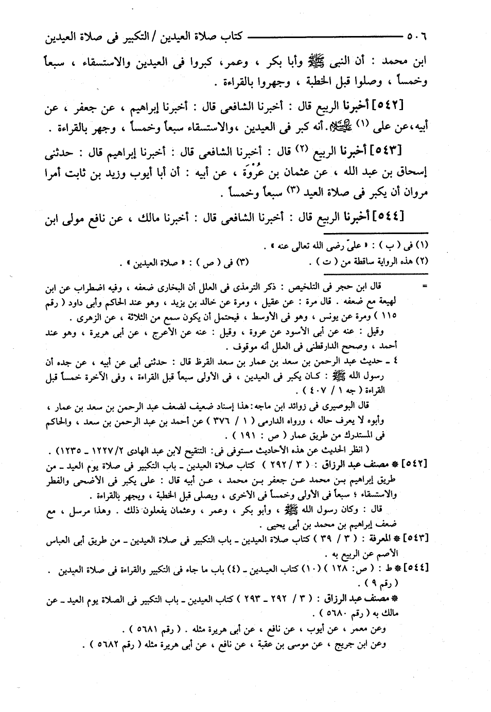 ابْنُ مُحَمَّدٍ { أَنَّ النَّبِيَّ - صلى الله عليه وسلم - وَأَبَا بَكْرٍ وَعُمَرَ كَبَّرُوا فِي الْعِيدَيْنِ وَالِاسْتِسْقَاءِ سَبْعًا وَخَمْسًا , وَصَلَّوْا قَبْلَ الْخُطْبَةِ , وَجَهَرُوا بِالْقِرَاءَةِ } أَخْبَرَنَا الرَّبِيعُ قَالَ أَخْبَرَنَا الشَّافِعِيُّ قَالَ أَخْبَرَنَا إبْرَاهِيمُ عَنْ جَعْفَرٍ عَنْ أَبِيهِ عَنْ عَلِيٍّ رضي الله تعالى عنه أَنَّهُ كَبَّرَ فِي الْعِيدَيْنِ وَالِاسْتِسْقَاءِ سَبْعًا وَخَمْسًا وَجَهَرَ بِالْقِرَاءَةِ أَخْبَرَنَا الرَّبِيعُ قَالَ أَخْبَرَنَا الشَّافِعِيُّ قَالَ أَخْبَرَنَا إبْرَاهِيمُ قَالَ حَدَّثَنِي إِسْحَاقُ بْنُ عَبْدِ اللَّهِ عَنْ عُثْمَانَ بْنِ عُرْوَةَ عَنْ أَبِيهِ أَنَّ أَبَا أَيُّوبَ وَزَيْدَ بْنَ ثَابِتٍ أَمَرَا مَرْوَانَ أَنْ يُكَبِّرَ فِي صَلاَةِ الْعِيدِ سَبْعًا , وَخَمْسًا أَخْبَرَنَا الرَّبِيعُ قَالَ أَخْبَرَنَا الشَّافِعِيُّ قَالَ أَخْبَرَنَا مَالِكٌ عَنْ نَافِعٍ مَوْلَى ابْنِ@