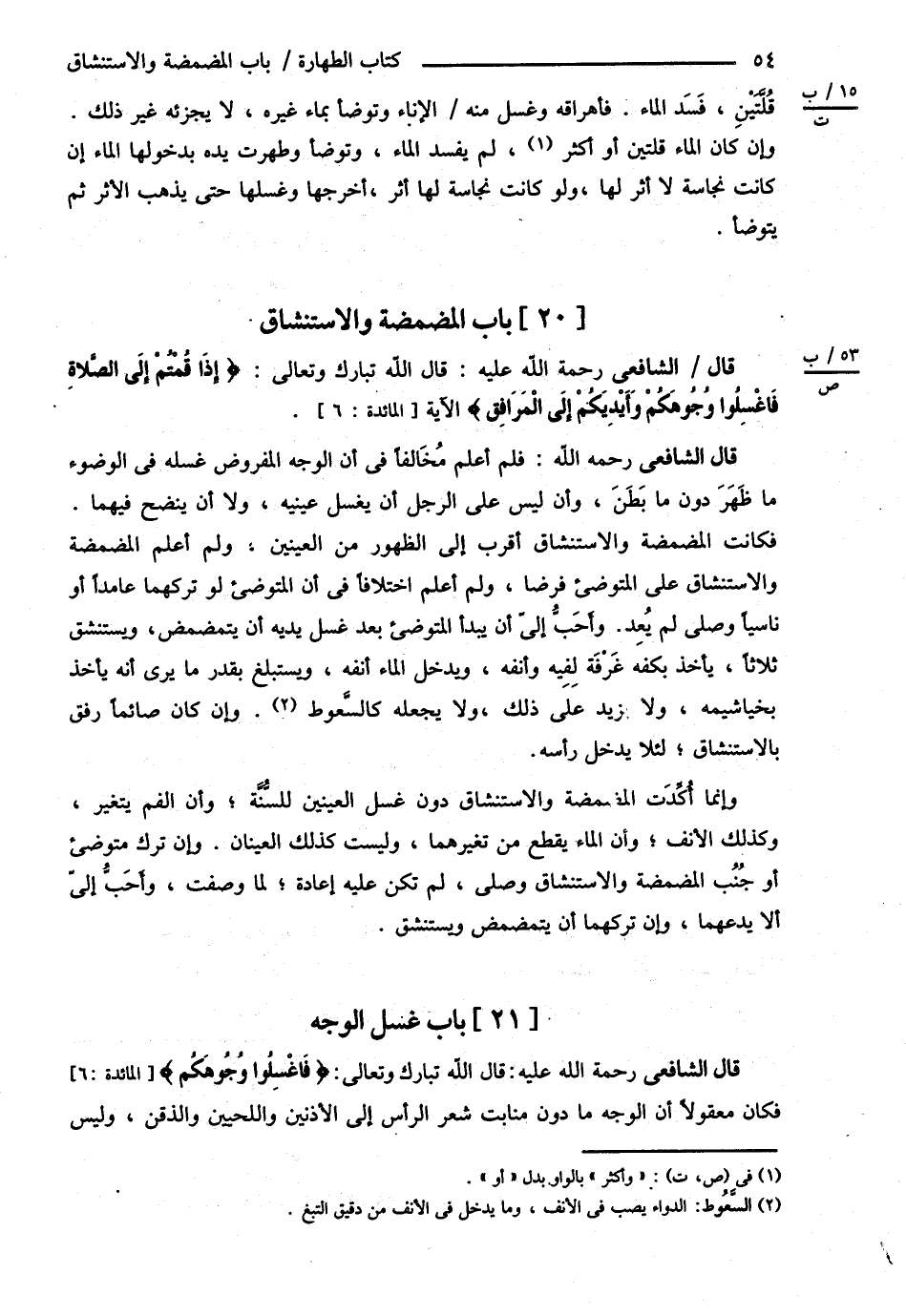 قَالَ الشَّافِعِيُّ : فَلَمْ أَعْلَمْ مُخَالِفًا فِي أَنَّ الْوَجْهَ الْمَفْرُوضَ غَسْلُهُ فِي الْوُضُوءِ - مَا ظَهَرَ دُونَ مَا بَطَنَ وَأَنْ لَيْسَ عَلَى الرَّجُلِ أَنْ يَغْسِلَ عَيْنَيْهِ وَلاَ أَنْ يَنْضَحَ فِيهِمَا فَكَانَتْ الْمَضْمَضَةُ وَالِاسْتِنْشَاقُ أَقْرَبَ إلَى الظُّهُورِ مِنْ الْعَيْنَيْنِ وَلَمْ أَعْلَمْ الْمَضْمَضَةَ وَالِاسْتِنْشَاقَ عَلَى الْمُتَوَضِّئِ فَرْضًا وَلَمْ أَعْلَمْ اخْتِلاَفًا فِي أَنَّ الْمُتَوَضِّئَ لَوْ تَرَكَهُمَا عَامِدًا أَوْ نَاسِيًا وَصَلَّى لَمْ يُعِدْ وَأَحَبُّ إلَيَّ أَنْ يَبْدَأَ الْمُتَوَضِّئُ بَعْدَ غَسْلِ يَدَيْهِ أَنْ يَتَمَضْمَضَ وَيَسْتَنْشِقَ ثَلاَثًا يَأْخُذَ بِكَفِّهِ غَرْفَةً لِفِيهِ وَأَنْفِهِ وَيُدْخِلَ الْمَاءَ أَنْفَهُ وَيَسْتَبْلِغَ بِقَدْرِ مَا يَرَى أَنَّهُ يَأْخُذُ بِخَيَاشِيمِهِ وَلاَ يَزِيدَ عَلَى ذَلِكَ وَلاَ يَجْعَلَهُ كَالسَّعُوطِ وَإِنْ كَانَ صَائِمًا رَفَقَ بِالِاسْتِنْشَاقِ لِئَلَّا يَدْخُلَ رَأْسَهُ وَإِنَّمَا أَكَّدْت الْمَضْمَضَةَ وَالِاسْتِنْشَاقَ دُونَ غَسْلِ الْعَيْنَيْنِ لِلسُّنَّةِ وَأَنَّ الْفَمَ يَتَغَيَّرُ وَكَذَلِكَ الْأَنْفُ وَأَنَّ الْمَاءَ يَقْطَعُ مِنْ تَغَيُّرِهِمَا وَلَيْسَتْ كَذَلِكَ الْعَيْنَانِ وَإِنْ تَرَكَ مُتَوَضِّئٌ أَوْ جُنُبٌ الْمَضْمَضَةَ وَالِاسْتِنْشَاقَ وَصَلَّى لَمْ تَكُنْ عَلَيْهِ إعَادَةٌ لِمَا وَصَفْت وَأَحَبُّ إلَيَّ أَنْ لاَ يَدَعَهُمَا وَإِنْ تَرَكَهُمَا أَنْ يَتَمَضْمَضَ وَيَسْتَنْشِقَ