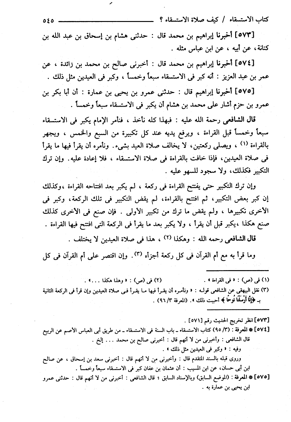 أَخْبَرَنَا إبْرَاهِيمُ بْنُ مُحَمَّدٍ قَالَ حَدَّثَنِي هِشَامُ بْنُ إِسْحَاقَ بْنِ عَبْدِ اللَّهِ بْنِ كِنَانَةَ عَنْ أَبِيهِ عَنْ ابْنِ عَبَّاسٍ مِثْلَهُ , أَخْبَرَنَا إبْرَاهِيمُ بْنُ مُحَمَّدٍ قَالَ أَخْبَرَنِي صَالِحُ بْنُ مُحَمَّدِ بْنِ زَائِدَةَ عَنْ عُمَرَ بْنِ عَبْدِ الْعَزِيزِ أَنَّهُ كَبَّرَ فِي الِاسْتِسْقَاءِ سَبْعًا وَخَمْسًا وَكَبَّرَ فِي الْعِيدَيْنِ مِثْلَ ذَلِكَ أَخْبَرَنَا إبْرَاهِيمُ قَالَ حَدَّثَنِي عَمْرُو بْنُ يَحْيَى بْنِ عُمَارَةَ أَنَّ أَبَا بَكْرِ بْنَ عَمْرِو بْنِ حَزْمٍ أَشَارَ عَلَى مُحَمَّدِ بْنِ هِشَامٍ أَنْ يُكَبِّرَ فِي الِاسْتِسْقَاءِ سَبْعًا , وَخَمْسًا