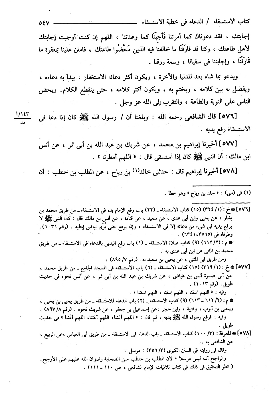 قَالَ الشَّافِعِيُّ : وَبَلَغَنَا { أَنَّ رَسُولَ اللَّهِ - صلى الله عليه وسلم - كَانَ إذَا دَعَا فِي الِاسْتِسْقَاءِ رَفَعَ يَدَيْهِ } أَخْبَرَنَا إبْرَاهِيمُ بْنُ مُحَمَّدٍ عَنْ شَرِيكِ بْنِ عَبْدِ اللَّهِ بْنِ أَبِي نَمِرٍ عَنْ أَنَسِ بْنِ مَالِكٍ { أَنَّ النَّبِيَّ - صلى الله عليه وسلم - كَانَ إذَا اسْتَسْقَى قَالَ : اللَّهُمَّ أَمْطِرْنَا } , أَخْبَرَنَا إبْرَاهِيمُ قَالَ حَدَّثَنِي خَالِدُ بْنُ رَبَاحٍ عَنْ الْمُطَّلِبِ بْنِ حَنْطَبٍ { أَنَّ@