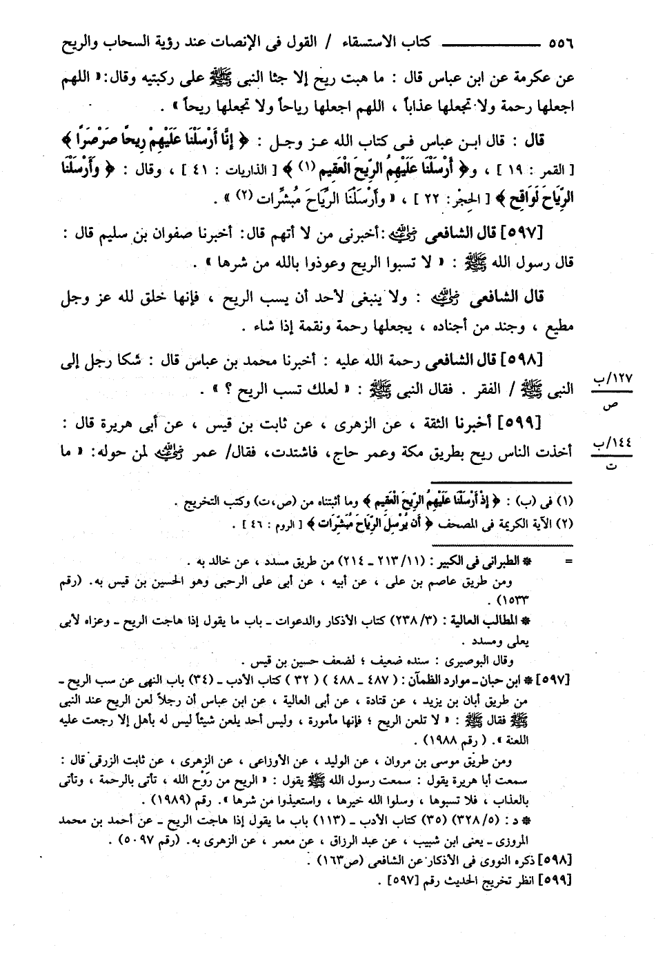 قَالَ الشَّافِعِيُّ: أَخْبَرَنَا مُحَمَّدُ بْنُ عَبَّاسٍ قَالَ {شَكَا رَجُلٌ إلَى النَّبِيِّ - صلى الله عليه وسلم - الْفَقْرَ فَقَالَ النَّبِيُّ - صلى الله عليه وسلم - لَعَلَّك تَسُبُّ الرِّيحَ؟} أَخْبَرَنَا الثِّقَةُ عَنْ الزُّهْرِيِّ عَنْ ثَابِتِ بْنِ قَيْسٍ عَنْ أَبِي هُرَيْرَةَ قَالَ أَخَذَتْ النَّاسَ رِيحٌ بِطَرِيقِ مَكَّةَ , وَعُمَرُ حَاجٌّ فَاشْتَدَّتْ فَقَالَ عُمَرُ رضي الله عنه لِمَنْ حَوْلَهُ: " مَا @