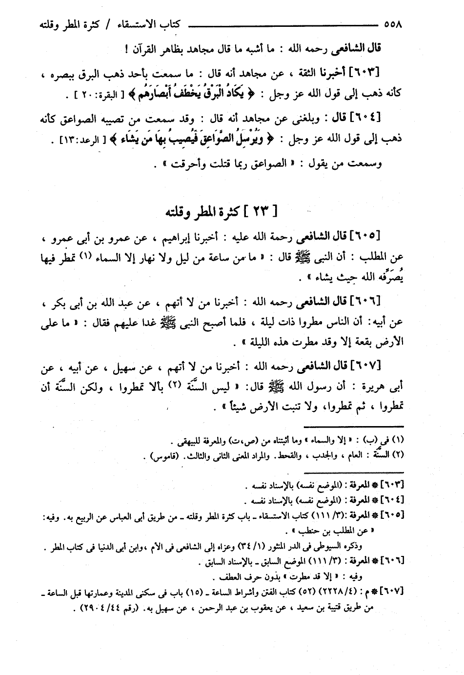 قَالَ الشَّافِعِيُّ : رحمه الله تعالى : أَخْبَرَنَا إبْرَاهِيمُ عَنْ عَمْرِو بْنِ أَبِي عَمْرٍو عَنْ الْمُطَّلِبِ أَنَّ النَّبِيَّ - صلى الله عليه وسلم - قَالَ { مَا مِنْ سَاعَةٍ مِنْ لَيْلٍ , وَلاَ نَهَارٍ إلَّا وَالسَّمَاءُ تُمْطِرُ فِيهَا يَصْرِفُهُ اللَّهُ حَيْثُ يَشَاءُ }