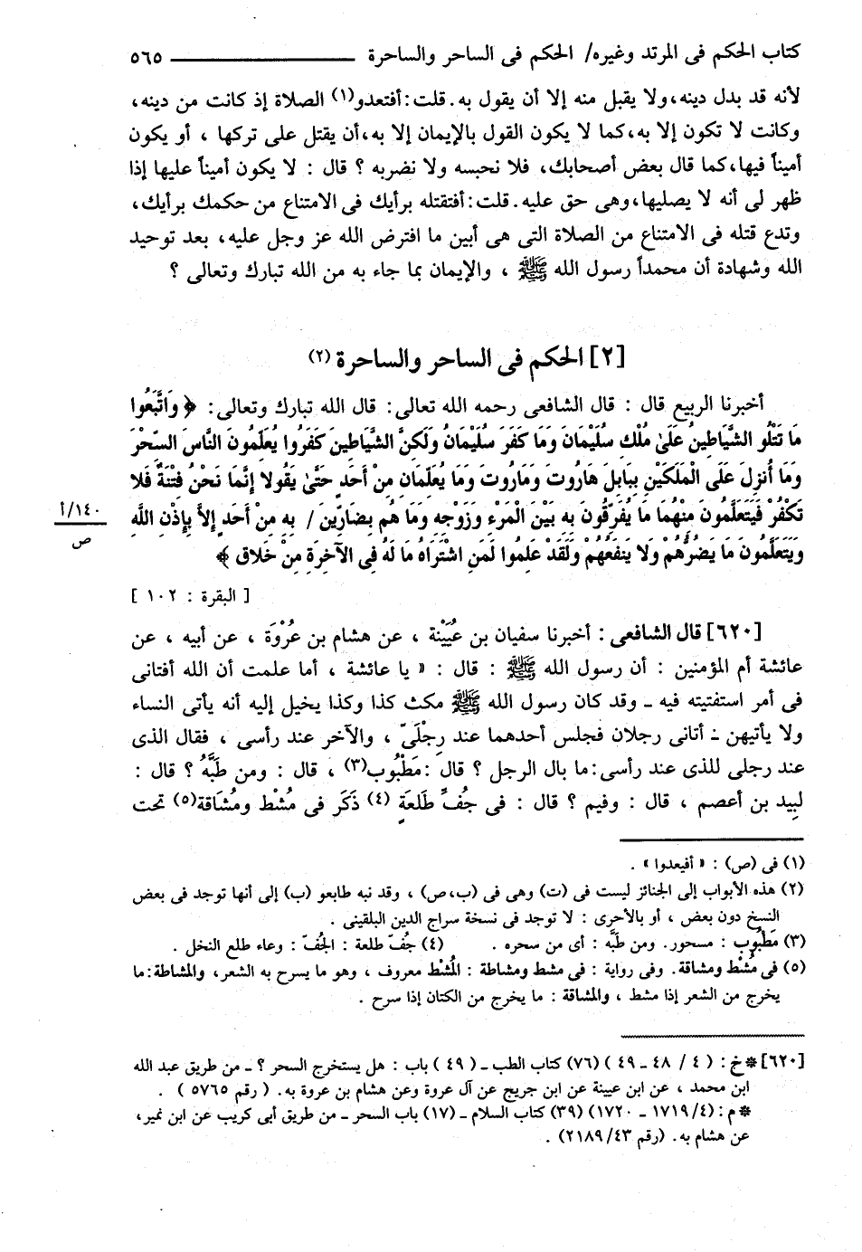 الْحُكْمُ فِي السَّاحِرِ وَالسَّاحِرَةِ . أَخْبَرَنَا الرَّبِيعُ قَالَ : قَالَ الشَّافِعِيُّ رحمه الله تعالى قَالَ اللَّهُ تَبَارَكَ وَتَعَالَى { وَاتَّبَعُوا مَا تَتْلُو الشَّيَاطِينُ عَلَى مُلْكِ سُلَيْمَانَ وَمَا كَفَرَ سُلَيْمَانُ وَلَكِنَّ الشَّيَاطِينَ كَفَرُوا يُعَلِّمُونَ النَّاسَ السِّحْرَ وَمَا أُنْزِلَ عَلَى الْمَلَكَيْنِ بِبَابِلَ هَارُوتَ وَمَارُوتَ وَمَا يُعَلِّمَانِ مِنْ أَحَدٍ حَتَّى يَقُولاَ إنَّمَا نَحْنُ فِتْنَةٌ فَلاَ تَكْفُرْ فَيَتَعَلَّمُونَ مِنْهُمَا مَا يُفَرِّقُونَ بِهِ بَيْنَ الْمَرْءِ وَزَوْجِهِ وَمَا هُمْ بِضَارِّينَ بِهِ مِنْ أَحَدٍ إلَّا بِإِذْنِ اللَّهِ وَيَتَعَلَّمُونَ مَا يَضُرُّهُمْ وَلاَ يَنْفَعُهُمْ وَلَقَدْ عَلِمُوا لِمَنْ اشْتَرَاهُ مَا لَهُ فِي الْآخِرَةِ مِنْ خَلاَقٍ } .