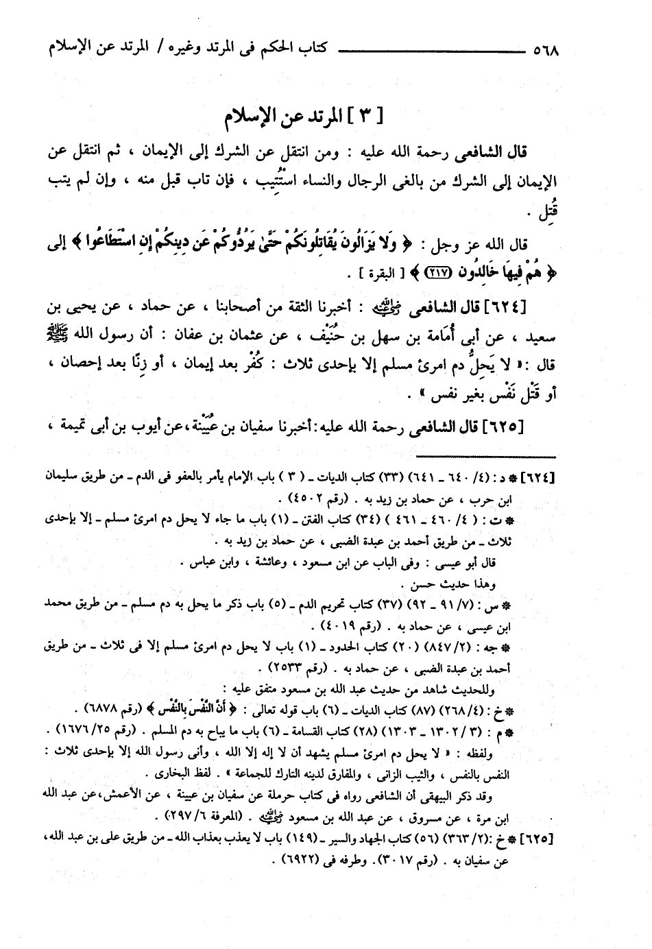 قَالَ الشَّافِعِيُّ : أَخْبَرَنَا الثِّقَةُ مِنْ أَصْحَابِنَا عَنْ حَمَّادٍ عَنْ يَحْيَى بْنِ سَعِيدٍ عَنْ أَبِي أُمَامَةَ بْنِ سَهْلِ بْنِ حُنَيْفٍ عَنْ عُثْمَانَ بْنِ عَفَّانَ أَنَّ رَسُولَ اللَّهِ - صلى الله عليه وسلم - قَالَ { لاَ يَحِلُّ دَمُ امْرِئٍ مُسْلِمٍ إلَّا بِإِحْدَى ثَلاَثٍ , كُفْرٍ بَعْدَ إيمَانٍ , أَوْ زِنًا بَعْدَ إحْصَانٍ , أَوْ قَتْلِ نَفْسٍ بِغَيْرِ نَفْسٍ }