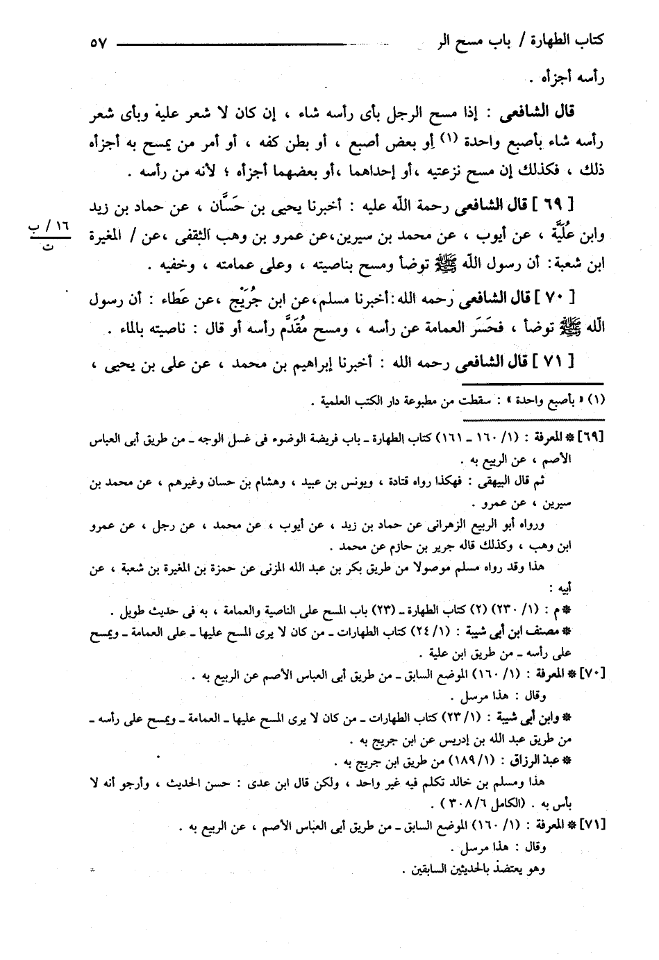 قَالَ الشَّافِعِيُّ : أَخْبَرَنَا يَحْيَى بْنُ حَسَّانٍ عَنْ حَمَّادِ بْنِ زَيْدٍ وَابْنِ عُلَيَّةَ عَنْ أَيُّوبَ عَنْ مُحَمَّدِ بْنِ سِيرِينَ عَنْ عَمْرِو بْنِ وَهْبٍ الثَّقَفِيِّ عَنْ الْمُغِيرَةِ بْنِ شُعْبَةَ { أَنَّ رَسُولَ اللَّهِ - صلى الله عليه وسلم - تَوَضَّأَ وَمَسَحَ بِنَاصِيَتِهِ وَعَلَى عِمَامَتِهِ وَخُفَّيْهِ ? .