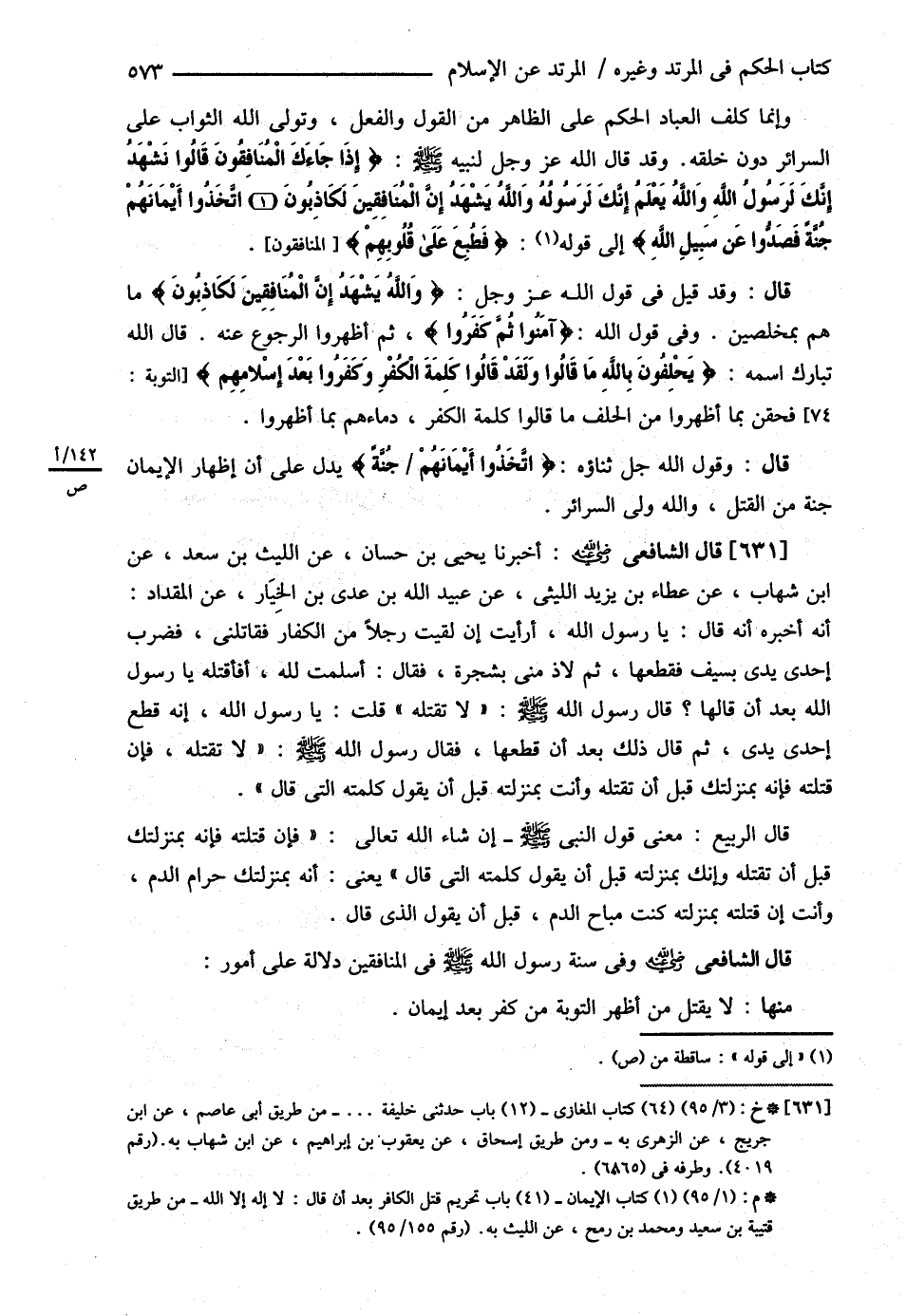 قَالَ الشَّافِعِيُّ : وَفِي سُنَّةِ رَسُولِ اللَّهِ - صلى الله عليه وسلم - فِي الْمُنَافِقِينَ دَلاَلَةٌ عَلَى أُمُورٍ مِنْهَا , لاَ يُقْتَلُ مَنْ أَظْهَرَ التَّوْبَةَ مِنْ كُفْرٍ بَعْدَ إيمَانٍ@