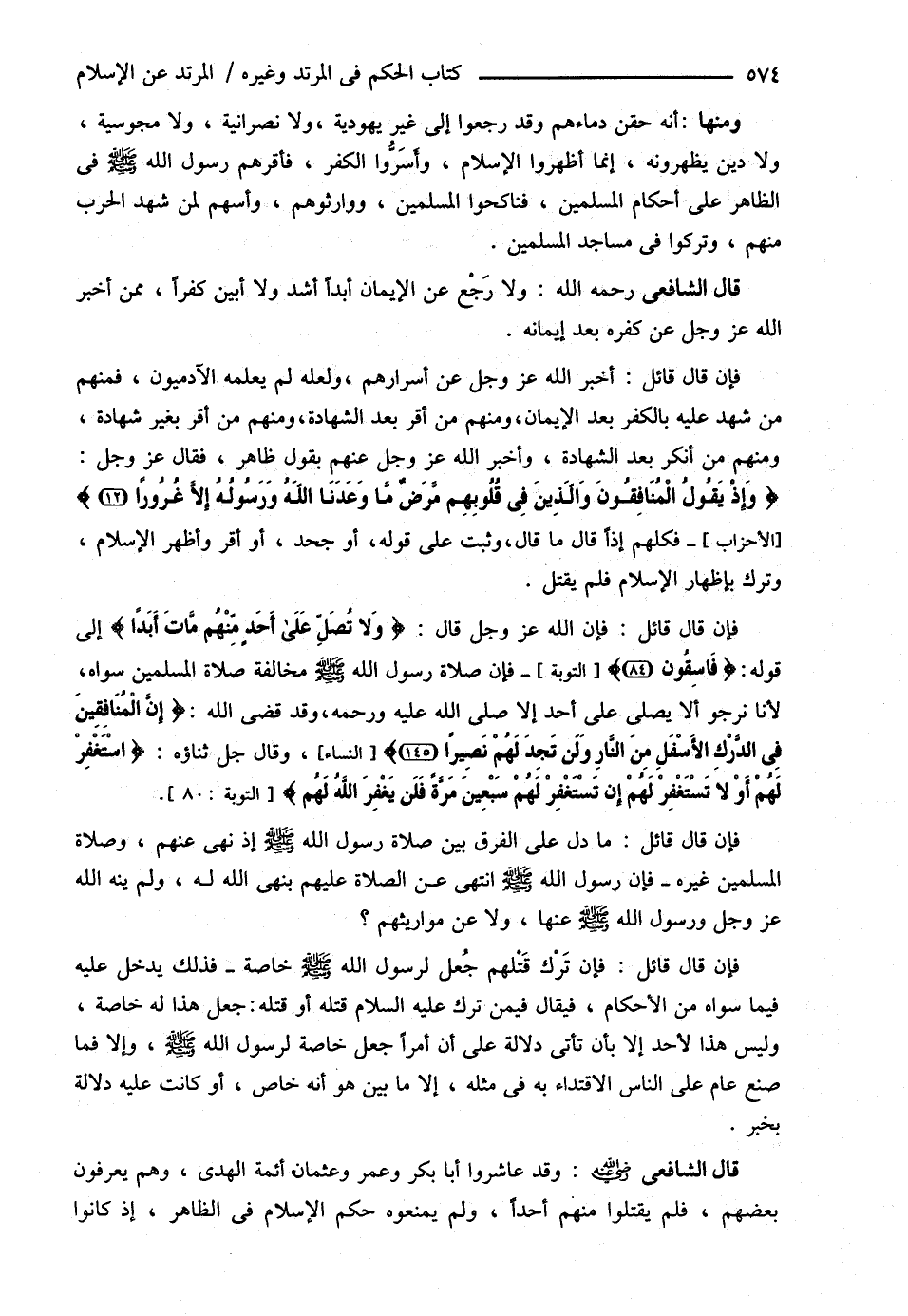 قَالَ الشَّافِعِيُّ : وَلاَ رَجْعَ عَنْ الْإِيمَانِ أَبَدًا أَشَدُّ وَلاَ أَبْيَنُ كُفْرًا مِمَّنْ أَخْبَرَ اللَّهُ عَزَّ وَجَلَّ عَنْ كُفْرِهِ بَعْدَ إيمَانِهِ فَإِنْ قَالَ قَائِلٌ أَخْبَرَ اللَّهُ عَزَّ وَجَلَّ عَنْ أَسْرَارِهِمْ , وَلَعَلَّهُ لَمْ يَعْلَمْهُ الْآدَمِيُّونَ فَمِنْهُمْ مَنْ شَهِدَ عَلَيْهِ بِالْكُفْرِ بَعْدَ الْإِيمَانِ , وَمِنْهُمْ مَنْ أَقَرَّ بَعْدَ الشَّهَادَةِ , وَمِنْهُمْ مَنْ أَقَرَّ بِغَيْرِ شَهَادَةٍ , وَمِنْهُمْ مَنْ أَنْكَرَ بَعْدَ الشَّهَادَةِ , وَأَخْبَرَ اللَّهُ عَزَّ وَجَلَّ عَنْهُمْ بِقَوْلٍ ظَاهِرٍ فَقَالَ عَزَّ وَجَلَّ : ? , وَإِذْ يَقُولُ الْمُنَافِقُونَ وَاَلَّذِينَ فِي قُلُوبِهِمْ مَرَضٌ مَا وَعَدَنَا اللَّهُ رَسُولُهُ إلَّا غُرُورًا } فَكُلُّهُمْ إذَا قَالَ مَا قَالَ , وَثَبَتَ عَلَى قَوْلِهِ أَوْ جَحَدَ أَوْ أَقَرَّ , وَأَظْهَرَ الْإِسْلاَمَ تُرِكَ بِإِظْهَارِ الْإِسْلاَمِ فَلَمْ يُقْتَلْ فَإِنْ قَالَ قَائِلٌ : فَإِنَّ اللَّهَ عَزَّ وَجَلَّ قَالَ { , وَلاَ تُصَلِّ عَلَى أَحَدٍ مِنْهُمْ مَاتَ أَبَدًا } إلَى قَوْلِهِ { فَاسِقُونَ } فَإِنَّ صَلاَةَ رَسُولِ اللَّهِ - صلى الله عليه وسلم - مُخَالِفَةٌ صَلاَةَ الْمُسْلِمِينَ سِوَاهُ لِأَنَّا نَرْجُو أَنْ لاَ يُصَلِّي عَلَى أَحَدٍ إلَّا صَلَّى اللَّهُ عَلَيْهِ وَرَحِمَهُ , وَقَدْ قَضَى اللَّهُ { إنَّ الْمُنَافِقِينَ فِي الدَّرْكِ الْأَسْفَلِ مِنْ النَّارِ وَلَنْ تَجِدْ لَهُمْ نَصِيرًا } , وَقَالَ جَلَّ ثَنَاؤُهُ { اسْتَغْفِرْ لَهُمْ أَوْ لاَ تَسْتَغْفِرْ لَهُمْ إنْ تَسْتَغْفِرْ لَهُمْ سَبْعِينَ مَرَّةً فَلَنْ يَغْفِرَ اللَّهُ لَهُمْ } فَإِنْ قَالَ قَائِلٌ : مَا دَلَّ عَلَى الْفَرْقِ بَيْنَ صَلاَةِ رَسُولِ اللَّهِ - صلى الله عليه وسلم - إذْ نُهِيَ عَنْهُمْ , وَصَلاَةِ الْمُسْلِمِينَ غَيْرِهِ , فَإِنَّ رَسُولَ اللَّهِ - صلى الله عليه وسلم - انْتَهَى عَنْ الصَّلاَةِ عَلَيْهِمْ بِنَهْيِ اللَّهِ لَهُ وَلَمْ يَنْهَ اللَّهُ عَزَّ وَجَلَّ وَرَسُولُهُ - صلى الله عليه وسلم - عَنْهَا , وَلاَ عَنْ مَوَارِيثِهِمْ فَإِنْ قَالَ قَائِلٌ فَإِنَّ تَرْكَ قَتْلِهِمْ جُعِلَ لِرَسُولِ اللَّهِ - صلى الله عليه وسلم - خَاصَّةً فَذَلِكَ يَدْخُلُ عَلَيْهِ فِيمَا سِوَاهُ مِنْ الْأَحْكَامِ فَيُقَالُ فِيمَنْ تَرَكَ عليه السلام قَتْلَهُ أَوْ قَتَلَهُ جُعِلَ هَذَا لَهُ خَاصَّةً وَلَيْسَ هَذَا لِأَحَدٍ إلَّا بِأَنْ تَأْتِيَ دَلاَلَةٌ عَلَى أَنَّ أَمْرًا جُعِلَ خَاصَّةً لِرَسُولِ اللَّهِ - صلى الله عليه وسلم - وَإِلَّا فَمَا صَنَعَ عَامٌّ , عَلَى النَّاسِ الِاقْتِدَاءُ بِهِ فِي مِثْلِهِ إلَّا مَا بَيَّنَ هُوَ أَنَّهُ خَاصٌّ أَوْ كَانَتْ عَلَيْهِ دَلاَلَةٌ بِخَبَرٍ