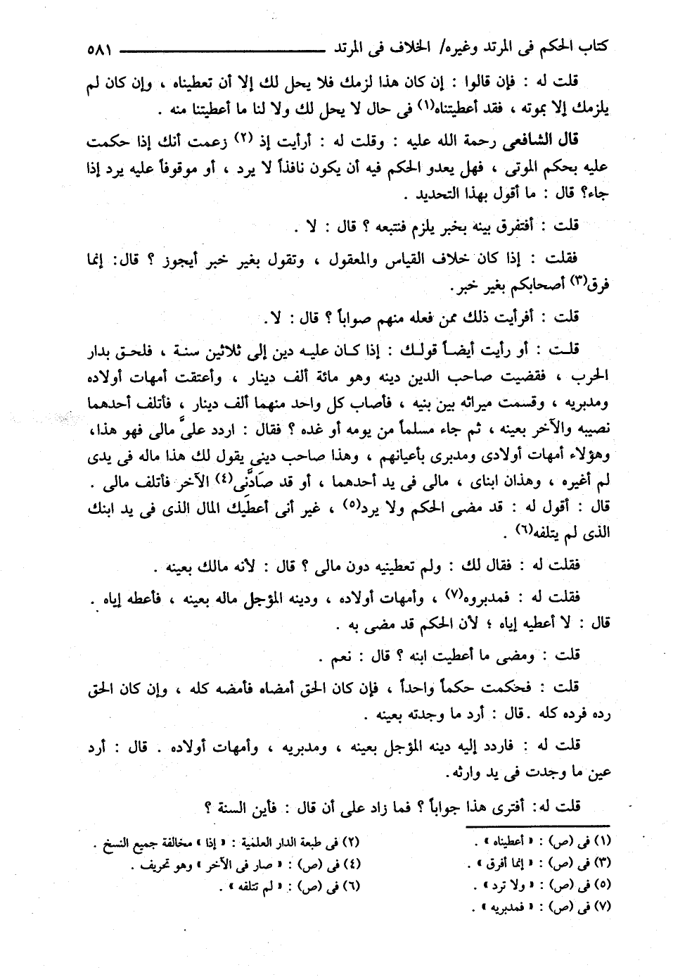 قال : أَرُدُّ مَا وَجَدْتُهُ بِعَيْنِهِ ( قُلْت ) : لَهُ فَارْدُدْ إلَيْهِ دَيْنَهُ الْمُؤَجَّلَ بِعَيْنِهِ وَمُدَبَّرِيهِ , وَأُمَّهَاتِ أَوْلاَدِهِ قَالَ : أَرُدُّ عَيْنَ مَا وَجَدْت فِي يَدِ وَارِثِهِ ( قُلْت ) : لَهُ أَفَتَرَى هَذَا جَوَابًا ؟ فَمَا زَادَ عَلَى أَنْ قَالَ فَأَيْنَ السُّنَّةُ ؟@