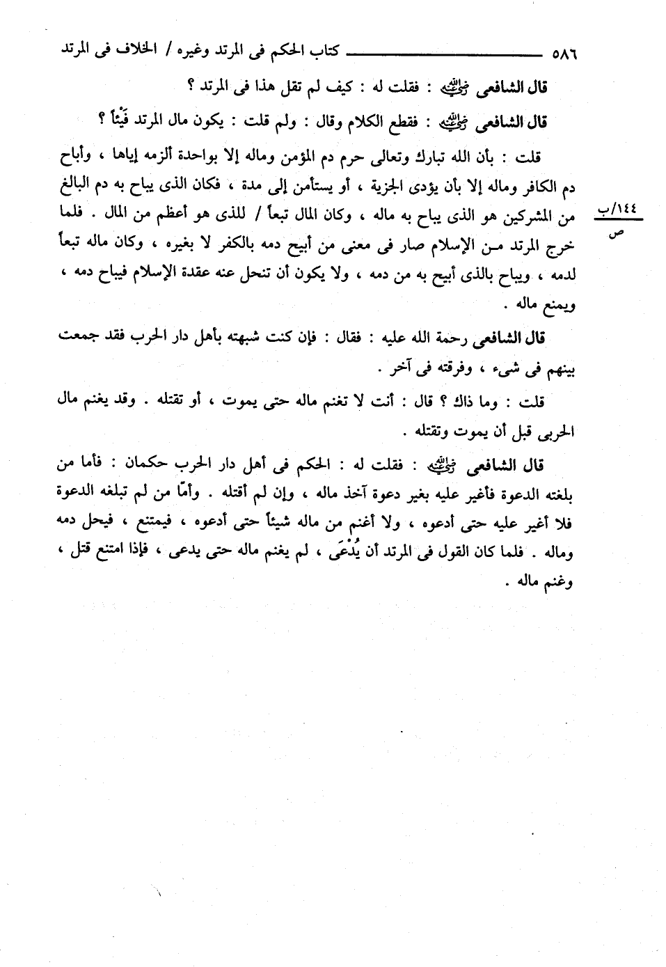 قَالَ الشَّافِعِيُّ : فَقُلْت لَهُ : الْحُكْمُ فِي أَهْلِ دَارِ الْحَرْبِ حُكْمَانِ : فَأَمَّا مَنْ بَلَغَتْهُ الدَّعْوَةُ فَأُغِيرُ عَلَيْهِ بِغَيْرِ دَعْوَةٍ آخُذُ مَالَهُ وَإِنْ لَمْ أَقْتُلْهُ , وَأَمَّا مَنْ لَمْ تَبْلُغْهُ الدَّعْوَةُ فَلاَ أُغِيرُ عَلَيْهِ حَتَّى أَدْعُوَهُ , وَلاَ أَغْنَمُ مِنْ مَالِهِ شَيْئًا حَتَّى أَدْعُوَهُ فَيَمْتَنِعُ فَيَحِلُّ دَمُهُ وَمَالُهُ , فَلَمَّا كَانَ الْقَوْلُ فِي الْمُرْتَدِّ أَنْ يُدْعَى لَمْ يُغْنَمْ مَالُهُ حَتَّى يُدْعَى , فَإِذَا امْتَنَعَ قُتِلَ , وَغُنِمَ مَالُهُ .@