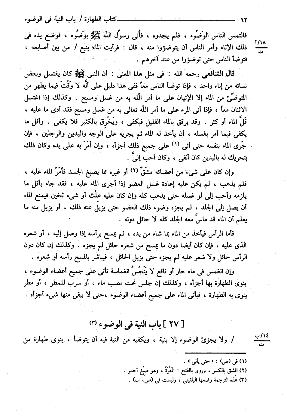 وَلاَ يُجْزِئُ الْوُضُوءُ إلَّا بِنِيَّةٍ وَيَكْفِيهِ مِنْ النِّيَّةِ فِيهِ أَنْ يَتَوَضَّأَ يَنْوِي طَهَارَةً مِنْ@
