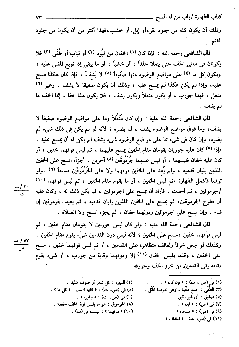 قَالَ الشَّافِعِيُّ : فَإِذَا كَانَ الْخُفَّانِ مِنْ لُبُودٍ أَوْ ثِيَابٍ أَوْ طُفًى فَلاَ يَكُونَانِ فِي مَعْنَى الْخُفِّ حَتَّى يُنَعَّلاَ جِلْدًا أَوْ خَشَبًا أَوْ مَا يَبْقَى إذَا تُوبِعَ الْمَشْيُ عَلَيْهِ وَيَكُونُ كُلُّ مَا عَلَى مَوَاضِعِ الْوُضُوءِ مِنْهَا صَفِيقًا لاَ يَشِفُّ فَإِذَا كَانَ هَكَذَا مَسَحَ عَلَيْهِ وَإِذَا لَمْ يَكُنْ هَكَذَا لَمْ يَمْسَحْ عَلَيْهِ وَذَلِكَ أَنْ يَكُونَ صَفِيقًا لاَ يَشِفُّ وَغَيْرُ مُنَعَّلٍ فَهَذَا جَوْرَبٌ أَوْ يَكُونَ مُنَعَّلاً وَيَكُونَ يَشِفُّ فَلاَ يَكُونُ هَذَا خُفًّا إنَّمَا الْخُفُّ مَا لَمْ يَشِفَّ .