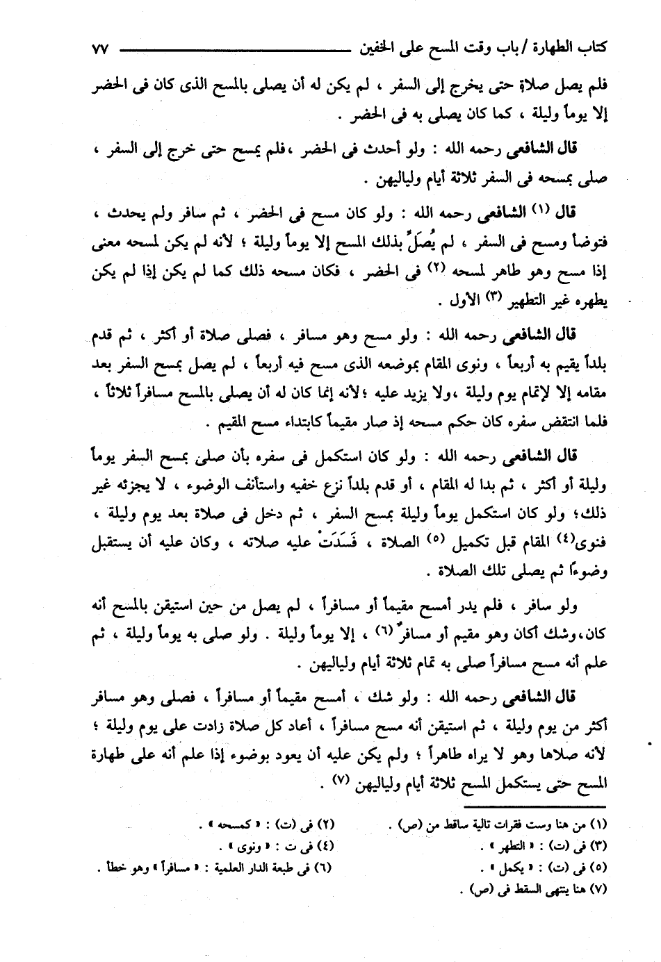 قَالَ الشَّافِعِيُّ : وَلَوْ كَانَ اسْتَكْمَلَ فِي سَفَرِهِ بِأَنْ صَلَّى بِمَسْحِ السَّفَرِ يَوْمًا وَلَيْلَةً أَوْ أَكْثَرَ ثُمَّ بَدَا لَهُ الْمُقَامُ أَوْ قَدِمَ بَلَدًا نَزَعَ خُفَّيْهِ وَاسْتَأْنَفَ الْوُضُوءَ لاَ يُجْزِئُهُ غَيْرُ ذَلِكَ وَلَوْ كَانَ اسْتَكْمَلَ يَوْمًا وَلَيْلَةً بِمَسْحِ السَّفَرِ ثُمَّ دَخَلَ فِي صَلاَةٍ بَعْدَ يَوْمٍ وَلَيْلَةٍ فَنَوَى الْمُقَامَ قَبْلَ تَكْمِيلِ الصَّلاَةِ فَسَدَتْ عَلَيْهِ صَلاَتُهُ وَكَانَ عَلَيْهِ أَنْ يَسْتَقْبِلَ وُضُوءًا ثُمَّ يُصَلِّيَ تِلْكَ الصَّلاَةَ .