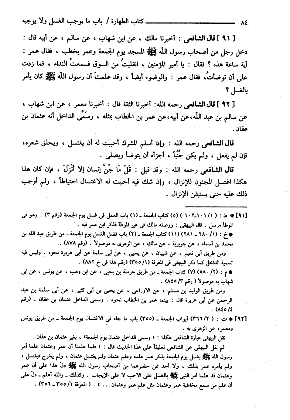 قَالَ الشَّافِعِيُّ : أَخْبَرَنَا مَالِكٌ عَنْ ابْنِ شِهَابٍ عَنْ سَالِمٍ عَنْ أَبِيهِ قَالَ دَخَلَ رَجُلٌ مِنْ أَصْحَابِ رَسُولِ اللَّهِ - صلى الله عليه وسلم - الْمَسْجِدَ يَوْمَ الْجُمُعَةِ وَعُمَرُ يَخْطُبُ فَقَالَ عُمَرُ أَيَّةُ سَاعَةٍ هَذِهِ ؟ فَقَالَ : يَا أَمِيرَ الْمُؤْمِنِينَ انْقَلَبْتُ مِنْ السُّوقِ فَسَمِعْت النِّدَاءَ فَمَا زِدْت عَلَى أَنْ تَوَضَّأْت فَقَالَ عُمَرُ : وَالْوُضُوءُ أَيْضًا وَقَدْ عَلِمْت أَنَّ رَسُولَ اللَّهِ - صلى الله عليه وسلم - كَانَ يَأْمُرُ بِالْغُسْلِ ؟