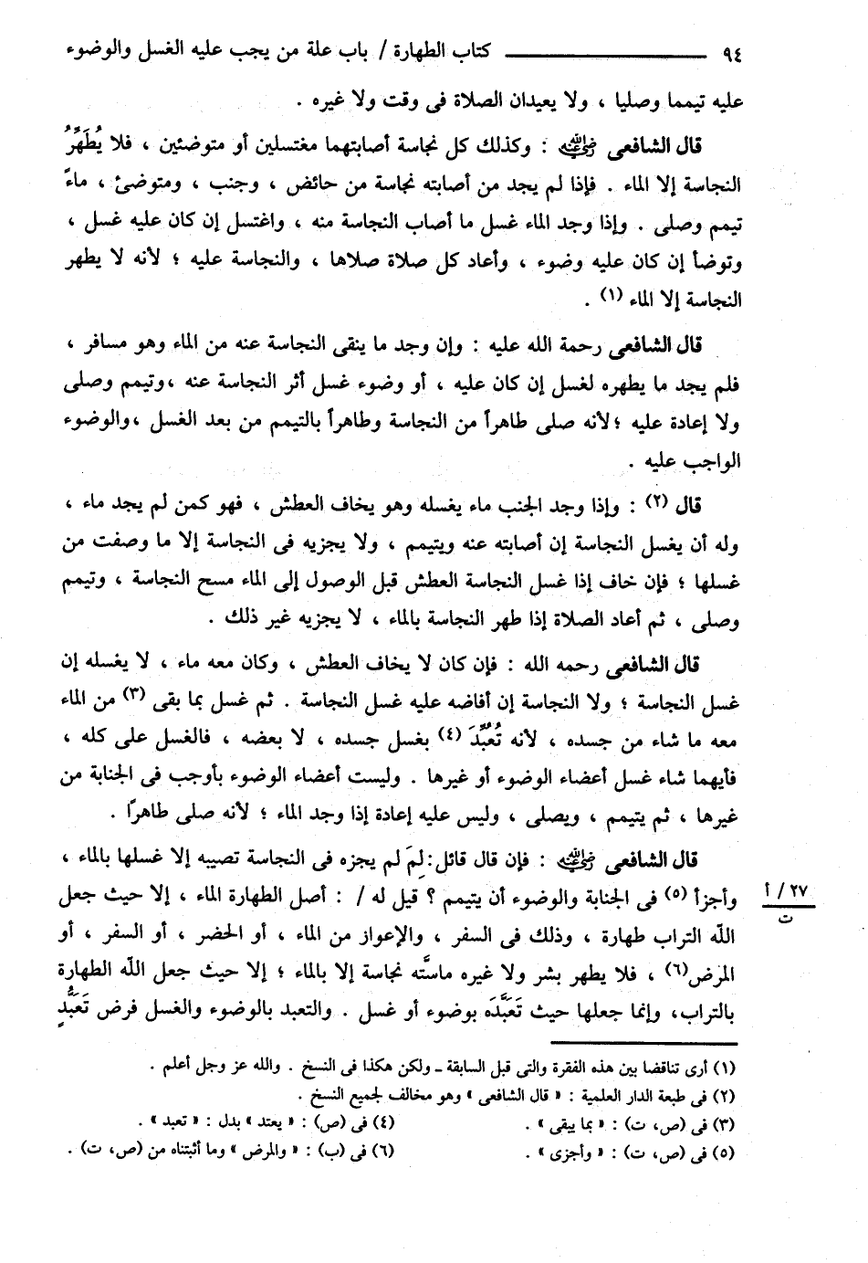 قَالَ الشَّافِعِيُّ : فَإِنْ قَالَ قَائِلٌ لِمَ لَمْ يُجِزْهُ فِي النَّجَاسَةِ تُصِيبُهُ إلَّا غَسْلُهَا بِالْمَاءِ وَأَجْزَأَ فِي الْجَنَابَةِ وَالْوُضُوءِ أَنْ يَتَيَمَّمَ ؟ قِيلَ لَهُ : أَصْلُ الطَّهَارَةِ الْمَاءُ إلَّا حَيْثُ جَعَلَ اللَّهُ التُّرَابَ طَهَارَةً وَذَلِكَ فِي السَّفَرِ وَالْإِعْوَازِ مِنْ الْمَاءِ أَوْ الْحَضَرِ أَوْ السَّفَرِ وَالْمَرَضِ فَلاَ يَطْهُرُ بَشَرٌ وَلاَ غَيْرُهُ مَاسَّتْهُ نَجَاسَةٌ إلَّا بِالْمَاءِ إلَّا حَيْثُ جَعَلَ اللَّهُ الطَّهَارَةَ بِالتُّرَابِ وَإِنَّمَا جَعَلَهَا حَيْثُ تَعَبَّدَهُ بِوُضُوءٍ أَوْ غُسْلٍ وَالتَّعَبُّدُ بِالْوُضُوءِ وَالْغُسْلِ فَرْضُ تَعَبُّدٍ@