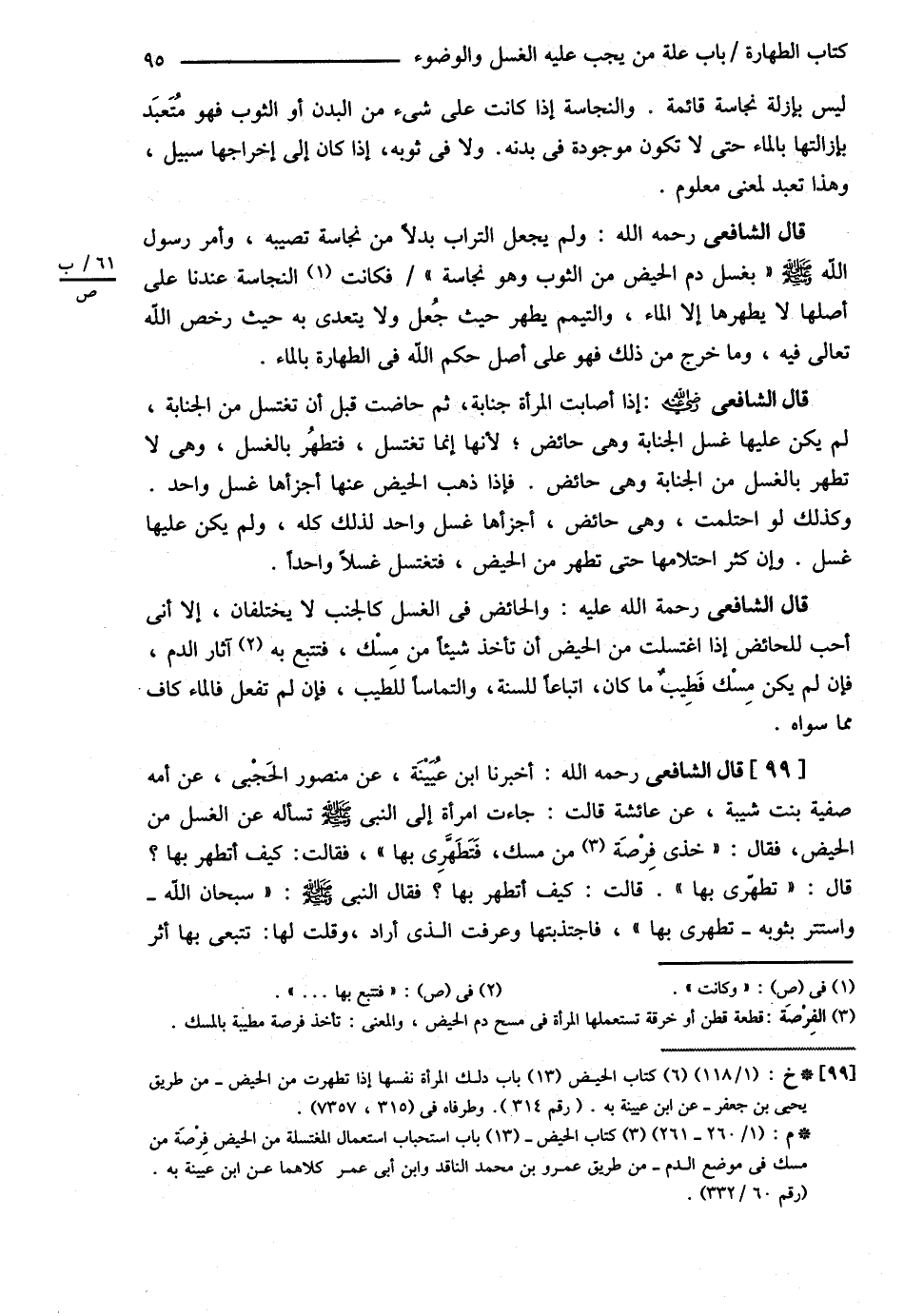 قَالَ الشَّافِعِيُّ : أَخْبَرَنَا ابْنُ عُيَيْنَةَ عَنْ مَنْصُورٍ الْحَجَبِيِّ عَنْ أُمِّهِ صَفِيَّةَ بِنْتِ شَيْبَةَ عَنْ عَائِشَةَ قَالَتْ { جَاءَتْ امْرَأَةٌ إلَى النَّبِيِّ - صلى الله عليه وسلم - تَسْأَلُهُ عَنْ الْغُسْلِ مِنْ الْحَيْضِ فَقَالَ : خُذِي فِرْصَةً مِنْ مِسْكٍ فَتَطَهَّرِي بِهَا فَقَالَتْ : كَيْفَ أَتَطَهَّرُ بِهَا ؟ قَالَ تَطَهَّرِي بِهَا , قَالَتْ : كَيْفَ أَتَطَهَّرُ بِهَا ؟ فَقَالَ النَّبِيُّ - صلى الله عليه وسلم - سُبْحَانَ اللَّهِ , وَاسْتَتَرَ بِثَوْبِهِ تَطَهَّرِي بِهَا فَاجْتَذَبْتهَا وَعَرَفْت الَّذِي أَرَادَ وَقُلْت لَهَا تَتَّبِعِي بِهَا أَثَرَ@