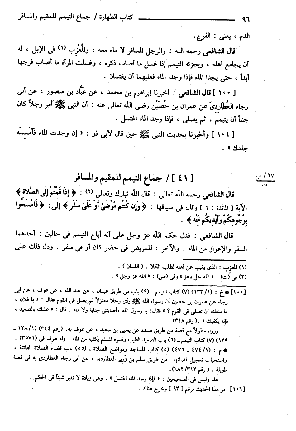 قَالَ الشَّافِعِيُّ : أَخْبَرَنَا إبْرَاهِيمُ بْنُ مُحَمَّدٍ عَنْ عَبَّادِ بْنِ مَنْصُورٍ عَنْ أَبِي رَجَاءٍ الْعُطَارِدِيِّ عَنْ عِمْرَانَ بْنِ حُصَيْنٍ رضي الله تعالى عنه عَنْهُ { أَنَّ النَّبِيَّ - صلى الله عليه وسلم - أَمَرَ رَجُلاً كَانَ جُنُبًا أَنْ يَتَيَمَّمَ ثُمَّ يُصَلِّيَ فَإِذَا وَجَدَ الْمَاءَ اغْتَسَلَ ? وَأَخْبَرَنَا بِحَدِيثِ { النَّبِيِّ - صلى الله عليه وسلم - حِينَ قَالَ لِأَبِي ذَرٍّ إنْ وَجَدْت الْمَاءَ فَأَمْسِسْهُ جِلْدَك ? .