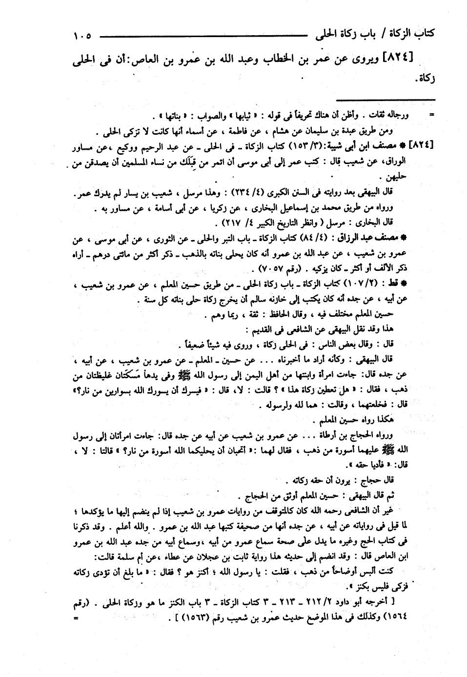 ابْنِ أَبِي مُلَيْكَةَ أَنَّ عَائِشَةَ رضي الله عنها كَانَتْ تُحَلِّي بَنَاتَ أَخِيهَا بِالذَّهَبِ , وَالْفِضَّةِ لاَ تُخْرِجُ زَكَاتَهُ أَخْبَرَنَا الرَّبِيعُ قَالَ أَخْبَرَنَا الشَّافِعِيُّ قَالَ أَخْبَرَنَا مَالِكٌ عَنْ نَافِعٍ عَنْ ابْنِ عُمَرَ أَنَّهُ كَانَ يُحَلِّي بَنَاتَه وَجَوَارِيَهُ الذَّهَبَ ثُمَّ لاَ يُخْرِجُ مِنْهُ الزَّكَاةَ أَخْبَرَنَا الرَّبِيعُ قَالَ أَخْبَرَنَا الشَّافِعِيُّ قَالَ أَخْبَرَنَا سُفْيَانُ عَنْ عَمْرِو بْنِ دِينَارٍ قَالَ سَمِعْت رَجُلاً يَسْأَلُ جَابِرَ بْنَ عَبْدِ اللَّهِ عَنْ الْحُلِيِّ : أَفِيه زَكَاةٌ ؟ فَقَالَ جَابِرٌ : لاَ فَقَالَ : وَإِنْ كَانَ يَبْلُغُ أَلْفَ دِينَارٍ ؟ فَقَالَ جَابِرٌ : كَثِيرٌ .