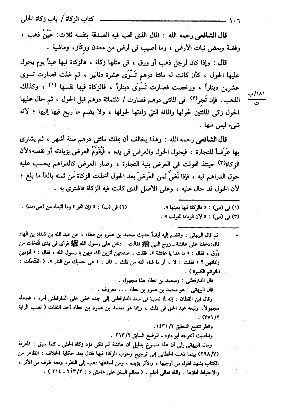 وَيُرْوَى عَنْ عُمَرَ بْنِ الْخَطَّابِ وَعَبْدِ اللَّهِ بْنِ عَمْرِو بْنِ الْعَاصِ أَنَّ فِي الْحُلِيِّ زَكَاةً .@