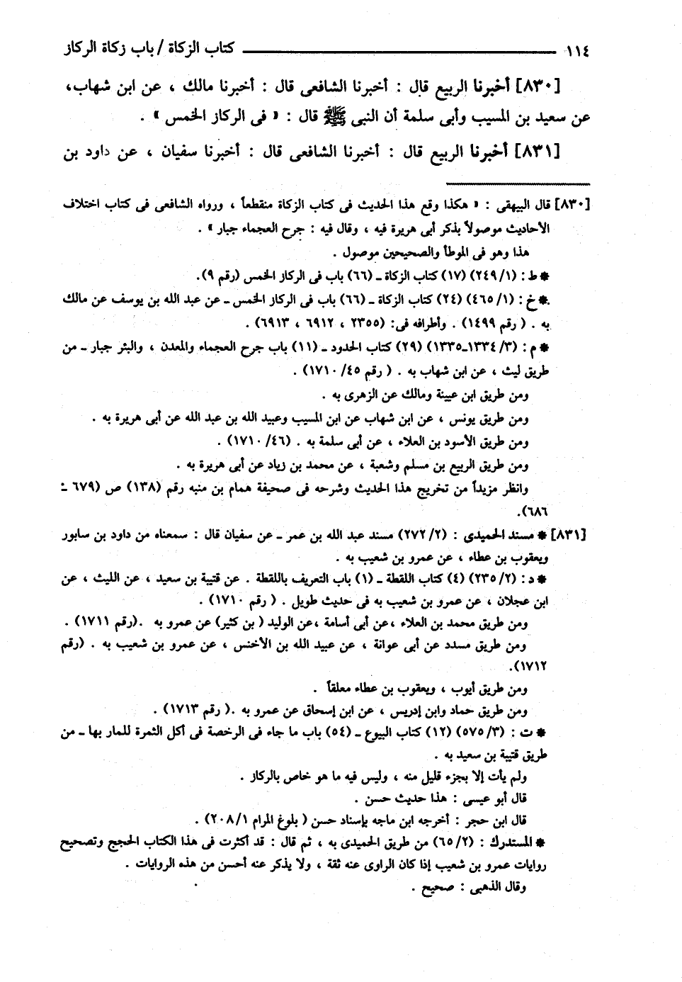 بَابُ زَكَاةِ الرِّكَازِ أَخْبَرَنَا الرَّبِيعُ قَالَ : أَخْبَرَنَا الشَّافِعِيُّ قَالَ أَخْبَرَنَا سُفْيَانُ بْنُ عُيَيْنَةَ عَنْ الزُّهْرِيِّ عَنْ سَعِيدِ بْنِ الْمُسَيِّبِ وَأَبِي سَلَمَةَ بْنِ عَبْدِ الرَّحْمَنِ عَنْ أَبِي هُرَيْرَةَ أَنَّ النَّبِيَّ - صلى الله عليه وسلم - قَالَ : { وَفِي الرِّكَازِ الْخُمْسُ } أَخْبَرَنَا الرَّبِيعُ قَالَ أَخْبَرَنَا الشَّافِعِيُّ قَالَ أَخْبَرَنَا سُفْيَانُ عَنْ أَبِي الزِّنَادِ عَنْ الْأَعْرَجِ عَنْ أَبِي هُرَيْرَةَ أَنَّ النَّبِيَّ - صلى الله عليه وسلم - قَالَ : { فِي الرِّكَازِ الْخُمْسُ }@