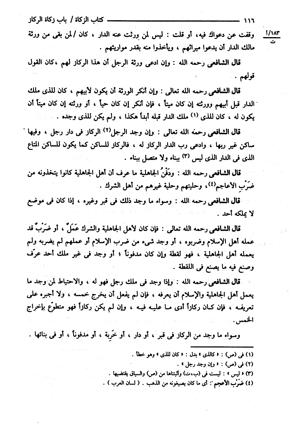 قال : وَالرِّكَازُ الَّذِي فِيهِ الْخُمْسُ دَفْنُ الْجَاهِلِيَّةِ مَا وُجِدَ فِي غَيْرِ مِلْكٍ لِأَحَدٍ فِي الْأَرْضِ الَّتِي مَنْ أَحْيَاهَا كَانَتْ لَهُ مِنْ بِلاَدِ الْإِسْلاَمِ , وَمِنْ أَرْضِ الْمَوَاتِ , وَكَذَلِكَ هَذَا فِي الْأَرْضِ مِنْ بِلاَدِ الْحَرْبِ , وَمِنْ بِلاَدِ الصُّلْحِ إلَّا أَنْ يَكُونُوا صَالَحُوا عَلَى مِلْكِ مَوَاتِهَا , فَمَنْ وَجَدَ دَفْنًا مِنْ دَفْنِ الْجَاهِلِيَّةِ فِي مَوَاتٍ , فَأَرْبَعَةُ أَخْمَاسِهِ لَهُ , وَالْخُمْسُ لِأَهْلِ سُهْمَانِ الصَّدَقَةِ