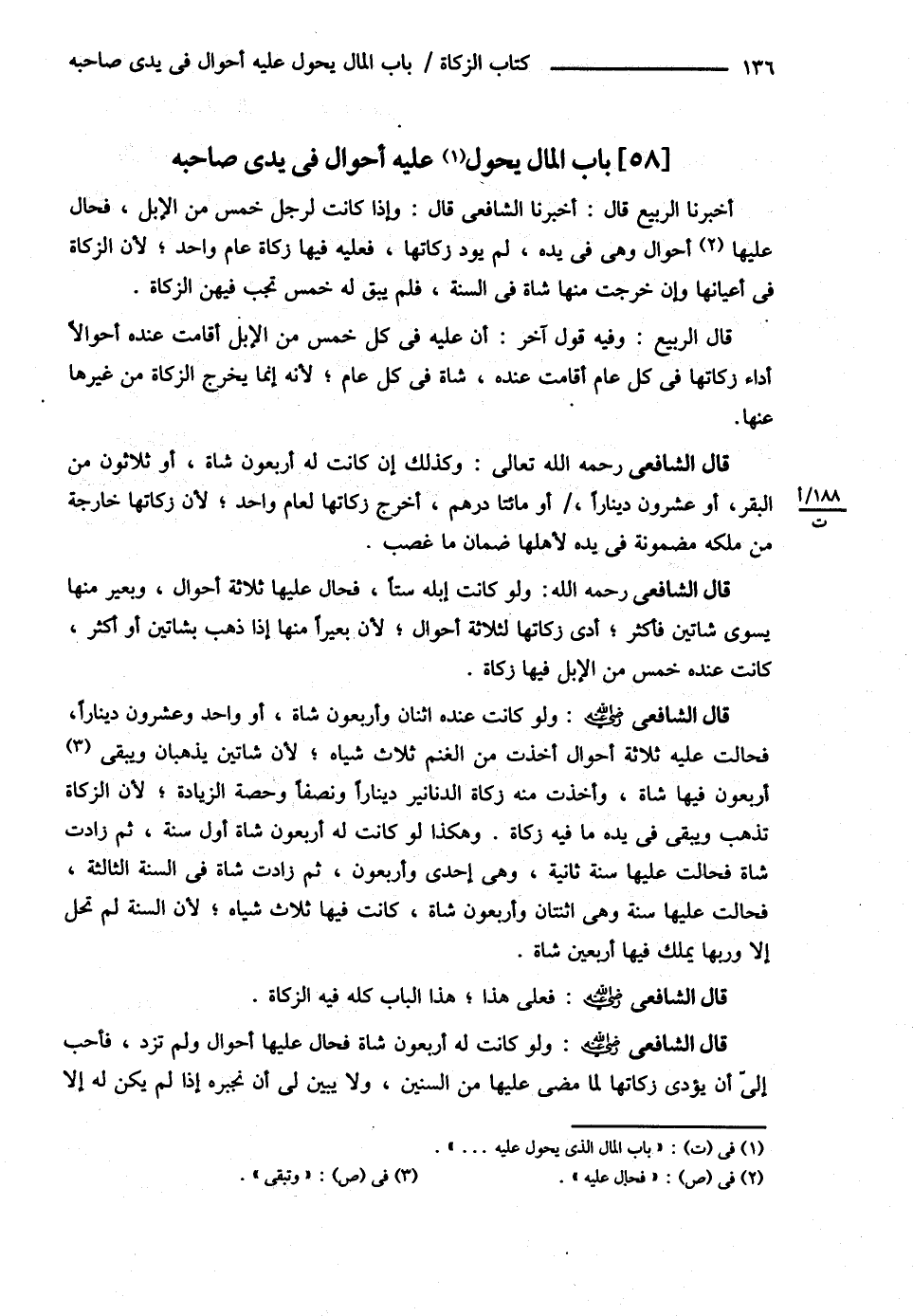 قَالَ الشَّافِعِيُّ : وَهَذَا هَكَذَا مِمَّا أَنْبَتَتْ الْأَرْضُ وَالتِّجَارَةُ وَغَيْرُ ذَلِكَ مِنْ الصَّدَقَةِ وَالْمَاشِيَةِ إلَّا أَنَّ الْمَاشِيَةَ تُخَالِفُ هَذَا فِي أَنَّهَا بِعَدَدٍ وَأَنَّهَا مَعْفُوٌّ عَنْهَا بَيْنَ الْعَدَدَيْنِ , فَإِنْ حَالَ عَلَيْهِ حَوْلٌ , هُوَ فِي سَفَرٍ فَلَمْ يَجِدْ مَنْ يَسْتَحِقُّ السُّهْمَانَ , أَوْ هُوَ فِي مِصْرَ فَطَلَبَ فَلَمْ يَحْضُرْهُ فِي سَاعَتِهِ تِلْكَ مَنْ يَسْتَحِقُّ السُّهْمَانَ , أَوْ سُجِنَ , أَوْ حِيلَ بَيْنَهُ وَبَيْنَ مَالِهِ , فَكُلُّ هَذَا عُذْرٌ , لاَ يَكُونُ بِهِ مُفَرِّطًا , وَمَا هَلَكَ مِنْ مَالِهِ بَعْدَ الْحَوْلِ لَمْ يُحْسَبْ عَلَيْهِ فِي الزَّكَاةِ كَمَا لاَ يُحْسَبُ مَا هَلَكَ قَبْلَ الْحَوْلِ , وَإِنْ كَانَ يُمْكِنُهُ إذَا حُبِسَ مَنْ يَثِقُ بِهِ فَلَمْ يَأْمُرْهُ بِذَلِكَ , أَوْ وَجَدَ أَهْلَ السُّهْمَانِ فَأَخَّرَ ذَلِكَ قَلِيلاً , أَوْ كَثِيرًا , هُوَ يُمْكِنُهُ فَلَمْ يُعْطِهِمْ بِوُجُودِ الْمَالِ وَأَهْلِ السُّهْمَانِ فَهُوَ مُفَرِّطٌ وَمَا هَلَكَ مِنْ مَالِهِ فَالزَّكَاةُ لاَزِمَةٌ لَهُ فِيمَا بَقِيَ فِي يَدَيْهِ مِنْهُ كَأَنْ كَانَتْ لَهُ عِشْرُونَ دِينَارًا فَأَمْكَنَهُ أَنْ يُؤَدِّيَ زَكَاتَهَا فَأَخَّرَهَا فَهَلَكَتْ الْعِشْرُونَ فَعَلَيْهِ نِصْفُ دِينَارٍ يُؤَدِّيهِ مَتَى وَجَدَهُ , لَوْ كَانَ لَهُ مَالٌ يُمْكِنُهُ أَنْ يُؤَدِّيَ زَكَاتَهُ فَلَمْ يَفْعَلْ فَوَجَبَتْ عَلَيْهِ الزَّكَاةُ سِنِينَ ثُمَّ هَلَكَ أَدَّى زَكَاتَهُ لِمَا فَرَّطَ فِيهِ , وَإِنْ كَانَتْ لَهُ مِائَةُ شَاةٍ فَأَقَامَتْ فِي يَدِهِ ثَلاَثَ سِنِينَ وَأَمْكَنَهُ فِي مُضِيِّ السَّنَةِ الثَّالِثَةِ أَدَاءُ زَكَاتِهَا فَلَمْ يُؤَدِّهَا أَدَّى زَكَاتَهَا لِثَلاَثِ سِنِينَ , وَإِنْ لَمْ يُمْكِنْهُ فِي السَّنَةِ الثَّالِثَةِ أَدَاءُ زَكَاتِهَا حَتَّى هَلَكَتْ فَلاَ زَكَاةَ عَلَيْهِ فِي السَّنَةِ الثَّالِثَةِ وَعَلَيْهِ الزَّكَاةُ فِي السَّنَتَيْنِ اللَّتَيْنِ فَرَّطَ فِي أَدَاءِ الزَّكَاةِ فِيهِمَا .@