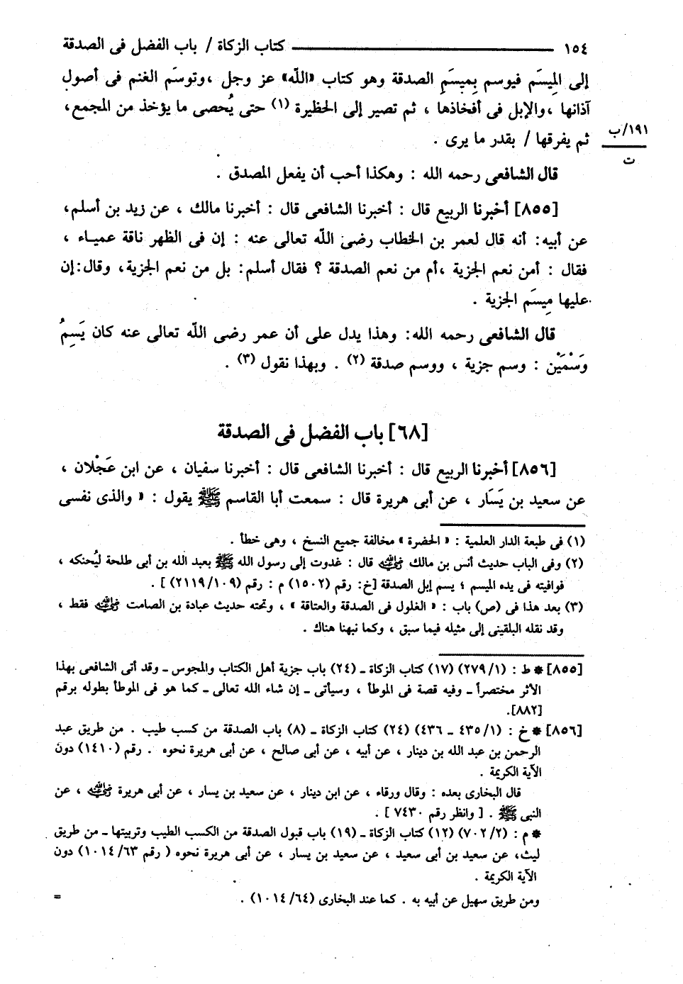 أَخْبَرَنَا الرَّبِيعُ قَالَ أَخْبَرَنَا الشَّافِعِيُّ قَالَ حَضَرْت عَمِّي مُحَمَّدَ بْنَ الْعَبَّاسِ تُؤْخَذُ الصَّدَقَاتُ بِحَضْرَتِهِ يَأْمُرُ بِالْحِظَارِ فَيُحْظَرُ وَيَأْمُرُ قَوْمًا فَيَكْتُبُونَ أَهْلَ السُّهْمَانِ ثُمَّ يَقِفُ رِجَالٌ دُونَ الْحِظَارِ قَلِيلاً ثُمَّ تُسَرَّبُ الْغَنَمُ بَيْنَ الرِّجَالِ وَالْحِظَارِ فَتَمُرُّ الْغَنَمُ سِرَاعًا وَاحِدَةٌ وَاثْنَتَانِ وَفِي يَدِ الَّذِي يَعُدُّهَا عَصًا يُشِيرُ بِهَا وَيَعُدُّ بَيْنَ يَدَيْ مُحَمَّدِ بْنِ الْعَبَّاسِ وَصَاحِبُ الْمَالِ مَعَهُ , فَإِنْ قَالَ أَخْطَأَ أَمَرَهُ بِالْإِعَادَةِ حَتَّى يَجْتَمِعَا عَلَى عَدَدٍ ثُمَّ يَأْخُذُ مَا وَجَبَ عَلَيْهِ بَعْدَمَا يَسْأَلُ رَبَّ الْمَالِ : هَلْ لَهُ مِنْ غَنَمٍ غَيْرِ مَا أَحْضَرَهُ ؟ فَيَذْهَبُ بِمَا أَخَذَ@