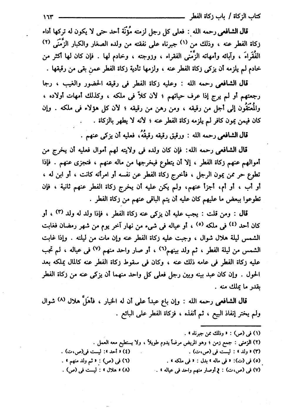 قَالَ الشَّافِعِيُّ: رحمه الله تعالى: وَبِهَذَا كُلِّهِ نَأْخُذُ وَفِي حَدِيثِ نَافِعٍ دَلاَلَةٌ عَلَى أَنَّ رَسُولَ اللَّهِ - صلى الله عليه وسلم - لَمْ يَفْرِضْهَا إلَّا عَلَى الْمُسْلِمِينَ , وَذَلِكَ مُوَافَقَةٌ لِكِتَابِ اللَّهِ عَزَّ وَجَلَّ , فَإِنَّهُ جَعَلَ الزَّكَاةَ لِلْمُسْلِمِينَ طَهُورًا وَالطَّهُورُ لاَ يَكُونُ إلَّا لِلْمُسْلِمِينَ وَفِي حَدِيثِ جَعْفَرٍ دَلاَلَةٌ عَلَى أَنَّ النَّبِيَّ - صلى الله عليه وسلم - فَرَضَهَا عَلَى الْمَرْءِ فِي نَفْسِهِ وَمَنْ يُمَوِّنُ قَالَ الشَّافِعِيُّ): وَفِي حَدِيثِ نَافِعٍ دَلاَلَةُ سُنَّةٍ بِحَدِيثِ جَعْفَرٍ إذْ فَرَضَهَا رَسُولُ اللَّهِ - صلى الله عليه وسلم - عَلَى الْحُرِّ وَالْعَبْدِ , وَالْعَبْدُ لاَ مَالَ لَهُ , وَبَيَّنَ أَنَّ رَسُولَ اللَّهِ - صلى الله عليه وسلم - إنَّمَا فَرَضَهَا عَلَى سَيِّدِهِ وَمَا لاَ اخْتِلاَفَ فِيهِ أَنَّ عَلَى السَّيِّدِ فِي عَبْدِهِ وَأَمَتِهِ زَكَاةَ الْفِطْرِ وَهُمَا مِمَّنْ يُمَوِّنُ.@