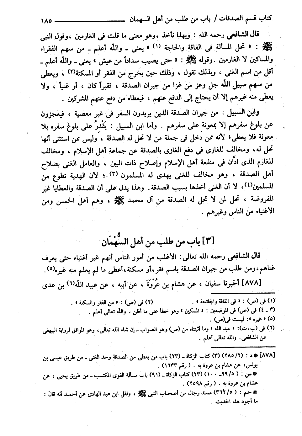 الْأَصْنَافِ كَانُوا أُعْطُوا لِأَنَّهُمْ مِنْ ذَلِكَ الصِّنْفِ وَلَمْ يُعْطَوْا مِنْ صَدَقَةِ غَيْرِهِ قَالَ وَإِذَا بَقِيَ فِي أَيْدِيهِمْ مِنْ أَمْوَالِهِمْ مَا يَكُونُونَ بِهِ أَغْنِيَاءَ وَإِنْ كَانَ عَلَيْهِمْ فِيهِ دَيْنٌ يُحِيطُ بِهِ لَمْ يُعْطَوْا مِنْ السُّهْمَانِ شَيْئًا لِأَنَّهُمْ مِنْ أَهْلِ الْغِنَى وَأَنَّهُمْ قَدْ يَبْرَءُونَ مِنْ الدَّيْنِ فَلاَ يُعْطَوْا حَتَّى لاَ يَبْقَى لَهُمْ مَا يَكُونُونَ بِهِ أَغْنِيَاءَ قَالَ وَصِنْفٌ ادَّانُوا فِي حَمَالاَتٍ وَإِصْلاَحِ ذَاتِ بَيْنٍ وَمَعْرُوفٍ وَلَهُمْ عُرُوضٌ تَحْمِلُ حَمَّالاَتهمْ أَوْ عَامَّتَهَا إنْ بِيعَتْ أَضَرَّ ذَلِكَ بِهِمْ وَإِنْ لَمْ يَفْتَقِرُوا فَيُعْطَى هَؤُلاَءِ مَا يُوَفِّرُ عُرُوضَهُمْ كَمَا يُعْطَى أَهْلُ الْحَاجَةِ مِنْ الْغَارِمِينَ حَتَّى يَقْضُوا غُرْمَهُمْ أَخْبَرَنَا سُفْيَانُ بْنُ عُيَيْنَةَ عَنْ هَارُونَ بْنِ رِئَابٍ عَنْ كِنَانَةَ بْنِ نُعَيْمٍ { عَنْ قَبِيصَةَ بْنِ مُخَارِقٍ الْهِلاَلِيِّ قَالَ تَحَمَّلْت بِحَمَالَةٍ فَأَتَيْت رَسُولَ اللَّهِ - صلى الله عليه وسلم - فَسَأَلْته فَقَالَ نُؤَدِّيهَا أَوْ نُخْرِجُهَا عَنْك غَدًا إذَا قَدِمَ نَعَمُ الصَّدَقَةِ يَا قَبِيصَةُ الْمَسْأَلَةُ حُرِّمَتْ إلَّا فِي ثَلاَثٍ رَجُلٍ تَحَمَّلَ حَمَالَةً فَحَلَّتْ لَهُ الْمَسْأَلَةُ حَتَّى يُؤَدِّيَهَا ثُمَّ يُمْسِكَ وَرَجُلٍ أَصَابَتْهُ فَاقَةٌ أَوْ حَاجَةٌ حَتَّى شَهِدَ لَهُ أَوْ تَكَلَّمَ ثَلاَثَةٌ مِنْ ذَوِي الْحِجَا مِنْ قَوْمِهِ أَنَّ بِهِ حَاجَةً أَوْ فَاقَةً فَحَلَّتْ لَهُ الْمَسْأَلَةُ حَتَّى يُصِيبَ سَدَادًا مِنْ عَيْشٍ أَوْ قِوَامًا مِنْ عَيْشٍ ثُمَّ يُمْسِكَ وَرَجُلٍ أَصَابَتْهُ جَائِحَةٌ فَاجْتَاحَتْ مَالَهُ حَتَّى يُصِيبَ سَدَادًا مِنْ عَيْشٍ أَوْ قِوَامًا مِنْ عَيْشٍ ثُمَّ يُمْسِكَ وَمَا سِوَى ذَلِكَ مِنْ الْمَسْأَلَةِ فَهُوَ سُحْتٌ }@