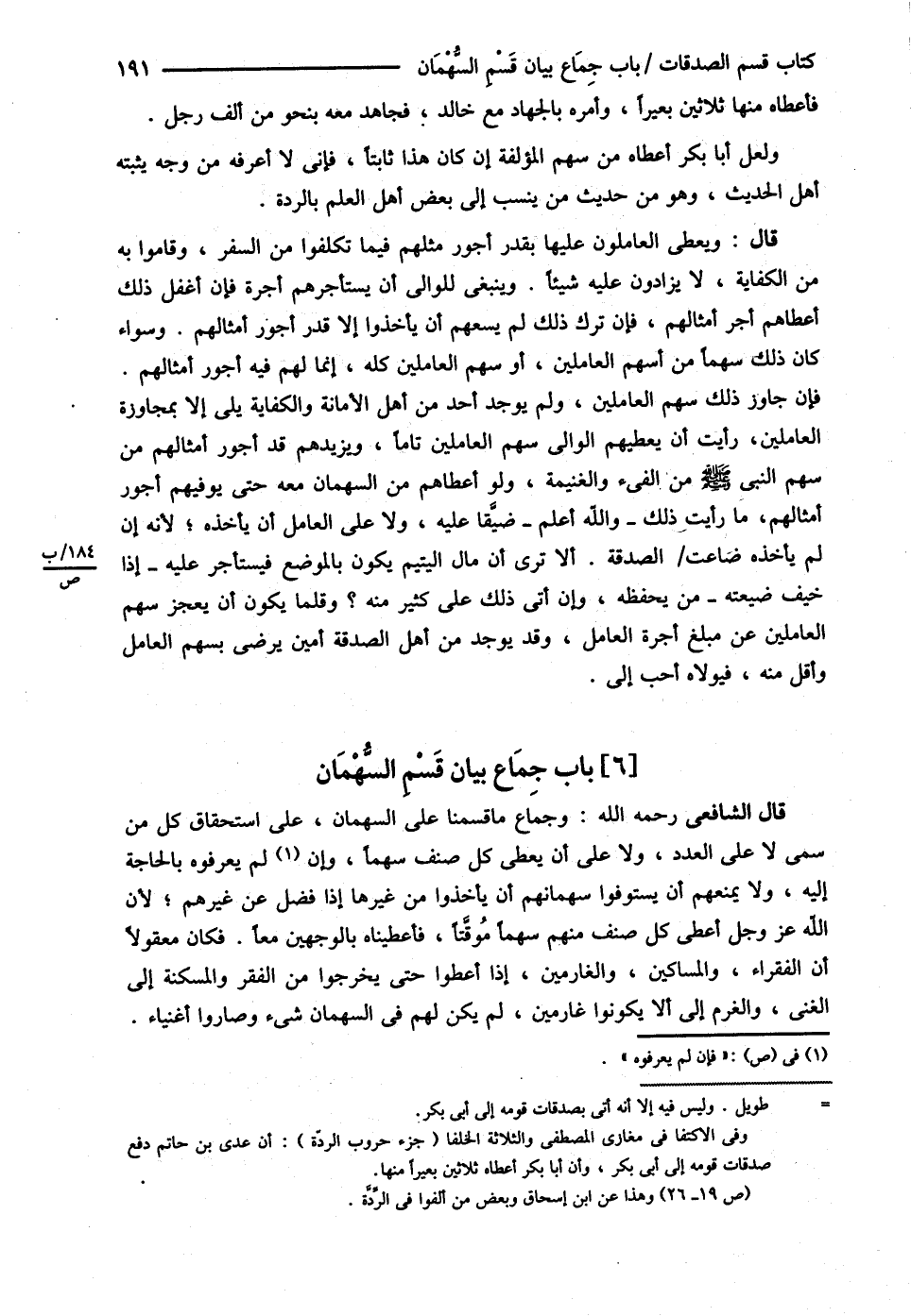 الْفُقَرَاءِ وَالْمَسَاكِينِ وَالْغَارِمِينَ ثُمَّ نَظَرْنَا فِي أَبْنَاءِ السَّبِيلِ فَمَيَّزْنَاهُمْ وَنَظَرْنَا الْبُلْدَانَ الَّتِي يُرِيدُونَ , فَإِنْ كَانَتْ بَعِيدَةً أَعْطَيْنَاهُمْ الْحُمْلاَنَ وَالنَّفَقَةَ , وَإِنْ كَانُوا يُرِيدُونَ الْبُدَاءَةَ فَالْبُدَاءَةُ وَحْدَهَا , وَإِنْ كَانُوا يُرِيدُونَ الْبُدَاءَةَ وَالرَّجْعَةَ فَالْبُدَاءَةُ وَالرَّجْعَةُ وَالنَّفَقَةُ مَبْلَغُ الطَّعَامِ وَالشَّرَابِ وَالْكِرَاءِ , وَإِنْ لَمْ يَكُنْ لَهُمْ مَلْبَسٌ فَالْمَلْبَسُ بِأَقَلَّ مَا يَكْفِي مَنْ كَانَ مِنْ أَهْلِ صِنْفٍ مِنْ هَذَا وَأَقْصَدِهِ , وَإِنْ كَانَ الْمَكَانُ قَرِيبًا وَابْنُ السَّبِيلِ ضَعِيفًا فَهَكَذَا . وَإِنْ كَانَ قَرِيبًا وَابْنُ السَّبِيلِ قَوِيًّا , فَالنَّفَقَةُ دُونَ الْحَمُولَةِ إذَا كَانَ بِلاَدًا يَمْشِي مِثْلَهَا مَأْهُولَةً مُتَّصِلَةَ الْمِيَاهِ مَأْمُونَةً , فَإِنْ انْتَاطَتْ مِيَاهُهَا , أَوْ أَخَافَتْ , أَوْ أَوْحَشَتْ أُعْطُوا الْحَمُولَةَ ثُمَّ صُنِعَ بِهِمْ فِيهَا كَمَا وَصَفْت فِي أَهْلِ السُّهْمَانِ قَبْلَهُمْ يُعْطَوْنَ عَلَى الْمُؤْنَةِ لاَ عَلَى الْعَدَدِ