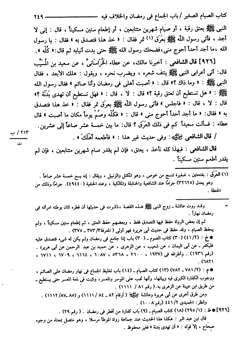 قَالَ الشَّافِعِيُّ : رحمه الله تعالى أَخْبَرَنَا مَالِكُ بْنُ أَنَسٍ عَنْ ابْنِ شِهَابٍ عَنْ حُمَيْدِ بْنِ عَبْدِ الرَّحْمَنِ عَنْ أَبِي هُرَيْرَةَ { أَنَّ رَجُلاً أَفْطَرَ فِي شَهْرِ رَمَضَانَ فَأَمَرَهُ @