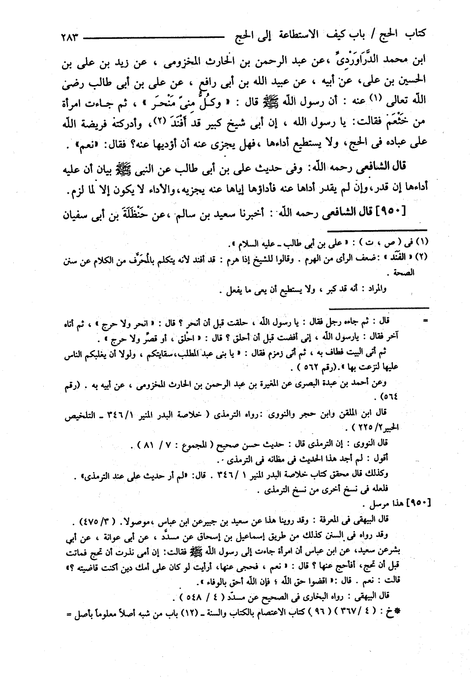 قَالَ الشَّافِعِيُّ : أَخْبَرَنَا مُسْلِمُ بْنُ خَالِدٍ الزِّنْجِيُّ عَنْ ابْنِ جُرَيْجٍ قَالَ : قَالَ ابْنُ شِهَابٍ حَدَّثَنِي سُلَيْمَانُ بْنُ يَسَارٍ عَنْ عَبْدِ اللَّهِ بْنِ عَبَّاسٍ عَنْ الْفَضْلِ بْنِ عَبَّاسٍ { أَنَّ امْرَأَةً مِنْ خَثْعَمَ قَالَتْ : يَا رَسُولَ اللَّهِ إنَّ أَبِي أَدْرَكَتْهُ فَرِيضَةُ اللَّهِ عَلَيْهِ فِي الْحَجِّ وَهُوَ شَيْخٌ كَبِيرٌ لاَ يَسْتَطِيعُ أَنْ يَسْتَوِيَ عَلَى ظَهْرِ بَعِيرِهِ قَالَ : فَحُجِّي عَنْهُ }