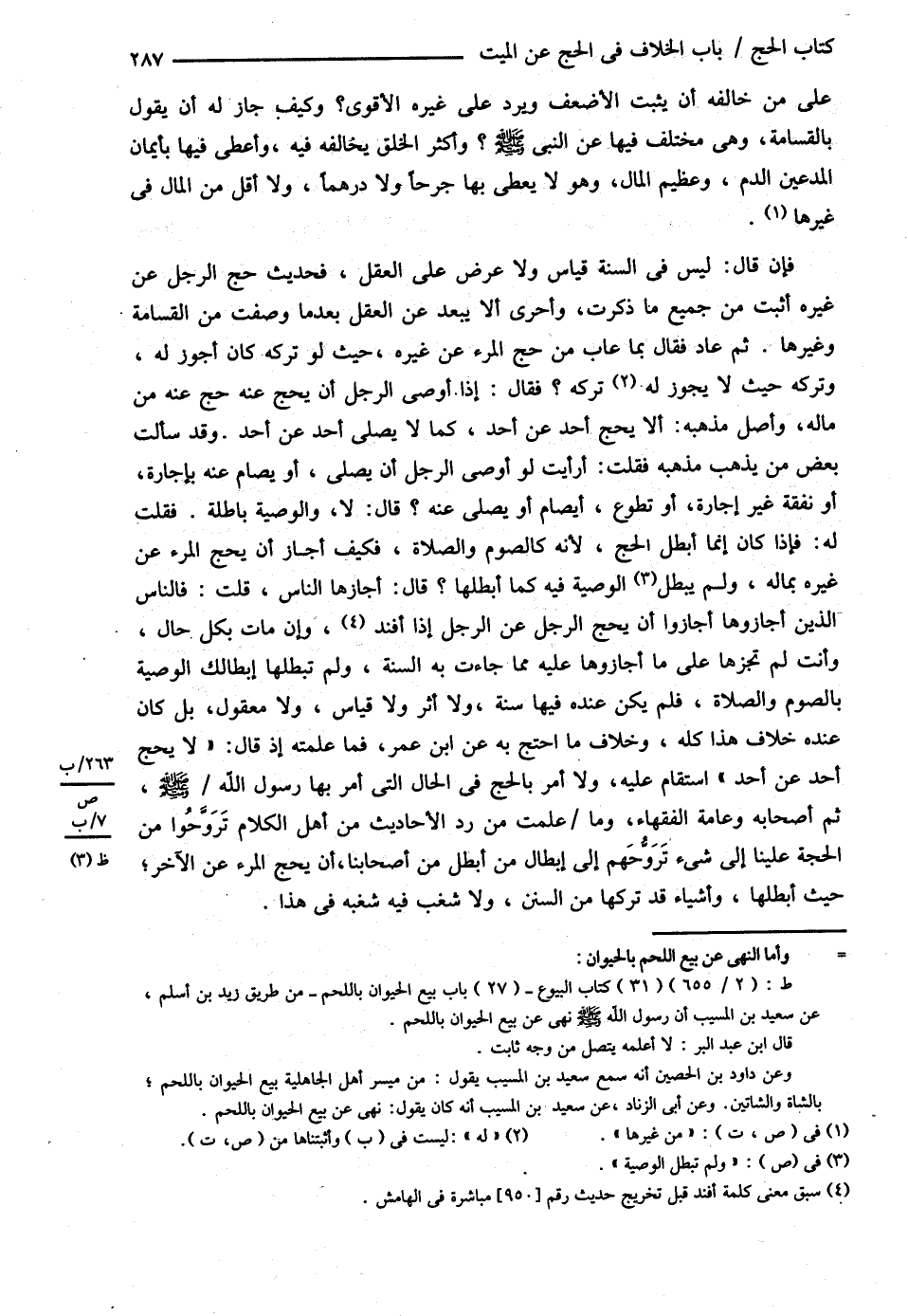 وَاَلَّذِي قَالَ لاَ يَحُجُّ أَحَدٌ عَنْ أَحَدٍ قَالَهُ , وَقَدْ رُوِيَ عَنْ النَّبِيِّ - صلى الله عليه وسلم - مِنْ ثَلاَثَةِ وُجُوهٍ سِوَى مَا رَوَى النَّاسُ عَنْ النَّبِيِّ - صلى الله عليه وسلم - مِنْ غَيْرِ ذَلِكَ , أَنَّهُ أَمَرَ بَعْضَ مَنْ سَأَلَهُ أَنْ يَحُجَّ عَنْ غَيْرِهِ ثُمَّ تَرَكَ مَا رُوِيَ عَنْ النَّبِيِّ - صلى الله عليه وسلم - وَاحْتَجَّ لَهُ بَعْضُ مَنْ قَالَ بِقَوْلِهِ بِأَنَّ ابْنَ عُمَرَ قَالَ لاَ يَحُجُّ أَحَدٌ عَنْ أَحَدٍ وَهُوَ يَرْوِي عَنْ ابْنِ عُمَرَ ثَلاَثَةً وَسِتِّينَ حَدِيثًا يُخَالِفُ ابْنَ عُمَرَ فِيهَا مِنْهَا مَا يَدَعُهُ لِمَا جَاءَ عَنْ النَّبِيِّ - صلى الله عليه وسلم - وَمِنْهَا مَا يَدَعُهُ لِمَا جَاءَ عَنْ بَعْضِ أَصْحَابِ النَّبِيِّ - صلى الله عليه وسلم - مِنْهَا مَا يَدَعُهُ لِقَوْلِ رَجُلٍ مِنْ التَّابِعِينَ وَمِنْهَا مَا يَدَعُهُ لِرَأْيِ نَفْسِهِ فَكَيْفَ جَازَ لِأَحَدٍ نَسَبَ نَفْسَهُ إلَى عِلْمٍ أَنْ يُحِلَّ قَوْلَ ابْنِ عُمَرَ عِنْدَهُ فِي هَذَا الْمَحَلِّ ثُمَّ يَجْعَلُهُ حُجَّةً عَلَى السُّنَّةِ وَلاَ يَجْعَلُهُ حُجَّةً عَلَى قَوْلِ نَفْسِهِ ؟ وَكَانَ مِنْ حُجَّةِ مَنْ قَالَ بِهَذَا الْقَوْلِ أَنْ قَالَ كَيْفَ يَجُوزُ أَنْ يَعْمَلَ رَجُلٌ عَنْ غَيْرِهِ وَلَيْسَ فِي سُنَّةِ رَسُولِ اللَّهِ - صلى الله عليه وسلم - إلَّا اتِّبَاعُهَا بِفَرْضِ اللَّهِ عَزَّ وَجَلَّ كَيْفَ وَالْمَسْأَلَةُ فِي شَيْءٍ قَدْ ثَبَتَتْ فِيهِ السُّنَّةُ مَا لاَ يَسَعُ عَالِمًا وَاَللَّهُ أَعْلَمُ , وَلَوْ جَازَ هَذَا لِأَحَدٍ جَازَ عَلَيْهِ مِثْلُهُ فَقَدْ يُثْبِتُ الَّذِي قَالَ هَذَا لِرَسُولِ اللَّهِ - صلى الله عليه وسلم - أَشْيَاءَ بِأَضْعَفَ مِنْ إسْنَادِ أَمْرِ النَّبِيِّ - صلى الله عليه وسلم - بَعْضَ النَّاسِ أَنْ يَحُجَّ عَنْ بَعْضٍ وَلَهُ فِي هَذَا مُخَالِفُونَ كَثِيرٌ مِنْهَا الْقَطْعُ فِي رُبْعِ دِينَارٍ وَمِنْهَا بَيْعُ الْعَرَايَا , وَمِنْهَا النَّهْيُ عَنْ بَيْعِ اللَّحْمِ بِالْحَيَوَانِ وَأَضْعَافُ هَذِهِ السُّنَنِ , فَكَيْفَ جَازَ لَهُ@
