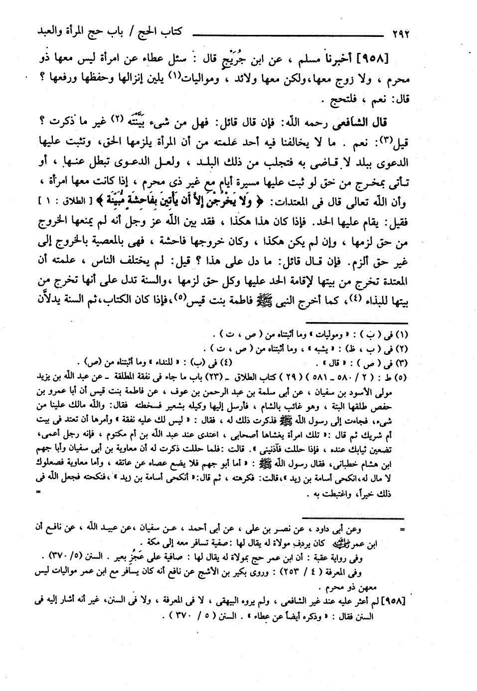 قَالَ الشَّافِعِيُّ : رحمه الله تعالى وَإِذَا كَانَ فِيمَا يُرْوَى عَنْ النَّبِيِّ - صلى الله عليه وسلم - مَا يَدُلُّ عَلَى أَنَّ السَّبِيلَ الزَّادُ وَالرَّاحِلَةُ وَكَانَتْ الْمَرْأَةُ تَجِدُهُمَا وَكَانَتْ مَعَ ثِقَةٍ مِنْ النِّسَاءِ فِي طَرِيقٍ مَأْهُولَةٍ آمِنَةٍ فَهِيَ مِمَّنْ عَلَيْهِ الْحَجُّ عِنْدِي وَاَللَّهُ أَعْلَمُ , وَإِنْ لَمْ يَكُنْ مَعَهَا ذُو مَحْرَمٍ ; لِأَنَّ رَسُولَ اللَّهِ - صلى الله عليه وسلم - لَمْ يَسْتَثْنِ فِيمَا يُوجِبُ الْحَجَّ إلَّا الزَّادَ وَالرَّاحِلَةَ , وَإِنْ لَمْ تَكُنْ مَعَ حُرَّةٍ مُسْلِمَةٍ ثِقَةٍ مِنْ النِّسَاءِ فَصَاعِدًا لَمْ تَخْرُجْ مَعَ رِجَالٍ لاَ امْرَأَةَ مَعَهُمْ وَلاَ مَحْرَمَ لَهَا مِنْهُمْ , وَقَدْ بَلَغَنَا عَنْ عَائِشَةَ وَابْنِ عُمَرَ وَابْنِ الزُّبَيْرِ مِثْلُ قَوْلِنَا فِي أَنْ تُسَافِرَ الْمَرْأَةُ لِلْحَجِّ , وَإِنْ لَمْ يَكُنْ مَعَهَا مَحْرَمٌ ,@