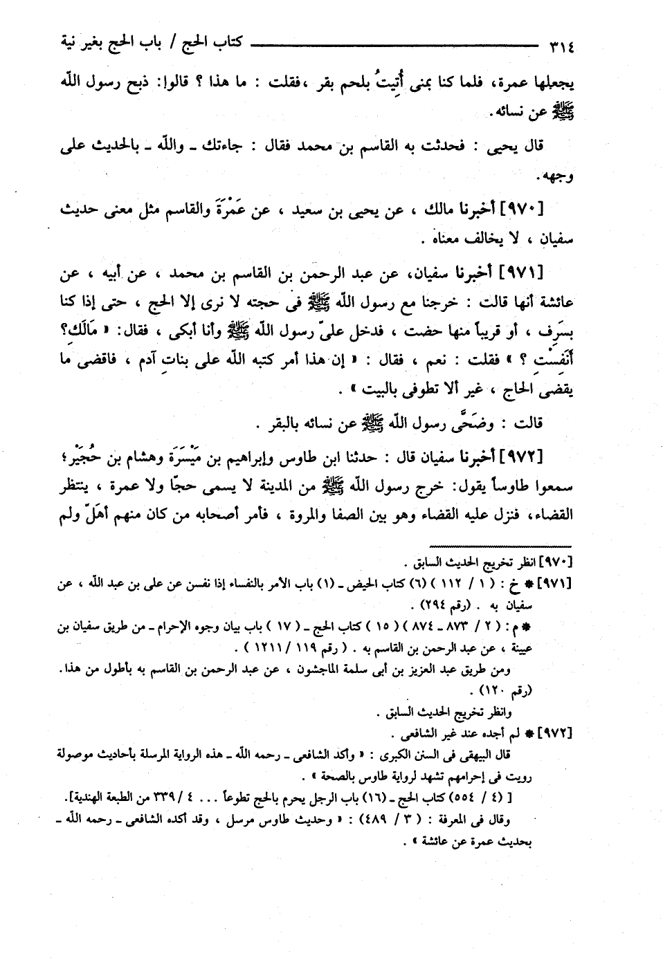 أَبِيهِ عَنْ جَابِرِ بْنِ عَبْدِ اللَّهِ وَهُوَ يُحَدِّثُ عَنْ حَجَّةِ النَّبِيِّ - صلى الله عليه وسلم - قَالَ { : خَرَجْنَا مَعَ النَّبِيِّ - صلى الله عليه وسلم - حَتَّى إذَا أَتَى الْبَيْدَاءَ فَنَظَرْت مَدَّ بَصَرِي مِنْ بَيْنِ رَاكِبٍ وَرَاجِلٍ مِنْ بَيْنِ يَدَيْهِ وَعَنْ يَمِينِهِ وَعَنْ شِمَالِهِ وَمِنْ وَرَائِهِ كُلُّهُمْ يُرِيدُ أَنْ يَأْتَمَّ بِهِ يَلْتَمِسُ أَنْ يَقُولَ كَمَا يَقُولُ رَسُولُ اللَّهِ - صلى الله عليه وسلم - لاَ يَنْوِي إلَّا الْحَجَّ وَلاَ يَعْرِفُ غَيْرَهُ وَلاَ يَعْرِفُ الْعُمْرَةَ فَلَمَّا طُفْنَا فَكُنَّا عِنْدَ الْمَرْوَةِ قَالَ : أَيُّهَا النَّاسُ مَنْ لَمْ يَكُنْ مَعَهُ هَدْيٌ فَلْيُحْلِلْ وَلْيَجْعَلْهَا عُمْرَةً وَلَوْ اسْتَقْبَلْت مِنْ أَمْرِي مَا اسْتَدْبَرْت مَا أَهْدَيْت فَحَلَّ مَنْ لَمْ يَكُنْ مَعَهُ هَدْيٌ } , أَخْبَرَنَا مُسْلِمُ بْنُ خَالِدٍ عَنْ ابْنِ جُرَيْجٍ عَنْ مَنْصُورِ بْنِ عَبْدِ الرَّحْمَنِ عَنْ صَفِيَّةَ بِنْتِ شَيْبَةَ عَنْ { أَسْمَاءَ بِنْتِ أَبِي بَكْرٍ قَالَتْ : خَرَجْنَا مَعَ النَّبِيِّ - صلى الله عليه وسلم - فَقَالَ النَّبِيُّ - صلى الله عليه وسلم - : مَنْ كَانَ مَعَهُ هَدْيٌ فَلْيُقِمْ عَلَى إحْرَامِهِ , وَمَنْ لَمْ يَكُنْ مَعَهُ هَدْيٌ فَلْيُحْلِلْ وَلَمْ يَكُنْ مَعِي هَدْيٌ فَحَلَلْت , وَكَانَ مَعَ الزُّبَيْرِ هَدْيٌ فَلَمْ يُحْلِلْ } , أَخْبَرَنَا ابْنُ عُيَيْنَةَ عَنْ يَحْيَى بْنِ سَعِيدٍ عَنْ عَمْرَةَ عَنْ { عَائِشَةَ رضي الله تعالى عنها قَالَتْ : خَرَجْنَا مَعَ رَسُولِ اللَّهِ - صلى الله عليه وسلم - لِخَمْسٍ بَقَيْنَ مِنْ ذِي الْقِعْدَةِ لاَ نَرَى إلَّا أَنَّهُ الْحَجُّ فَلَمَّا كُنَّا بِسَرِفٍ أَوْ قَرِيبًا مِنْهَا أَمَرَ النَّبِيُّ - صلى الله عليه وسلم - مَنْ لَمْ يَكُنْ مَعَهُ هَدْيٌ أَنْ@