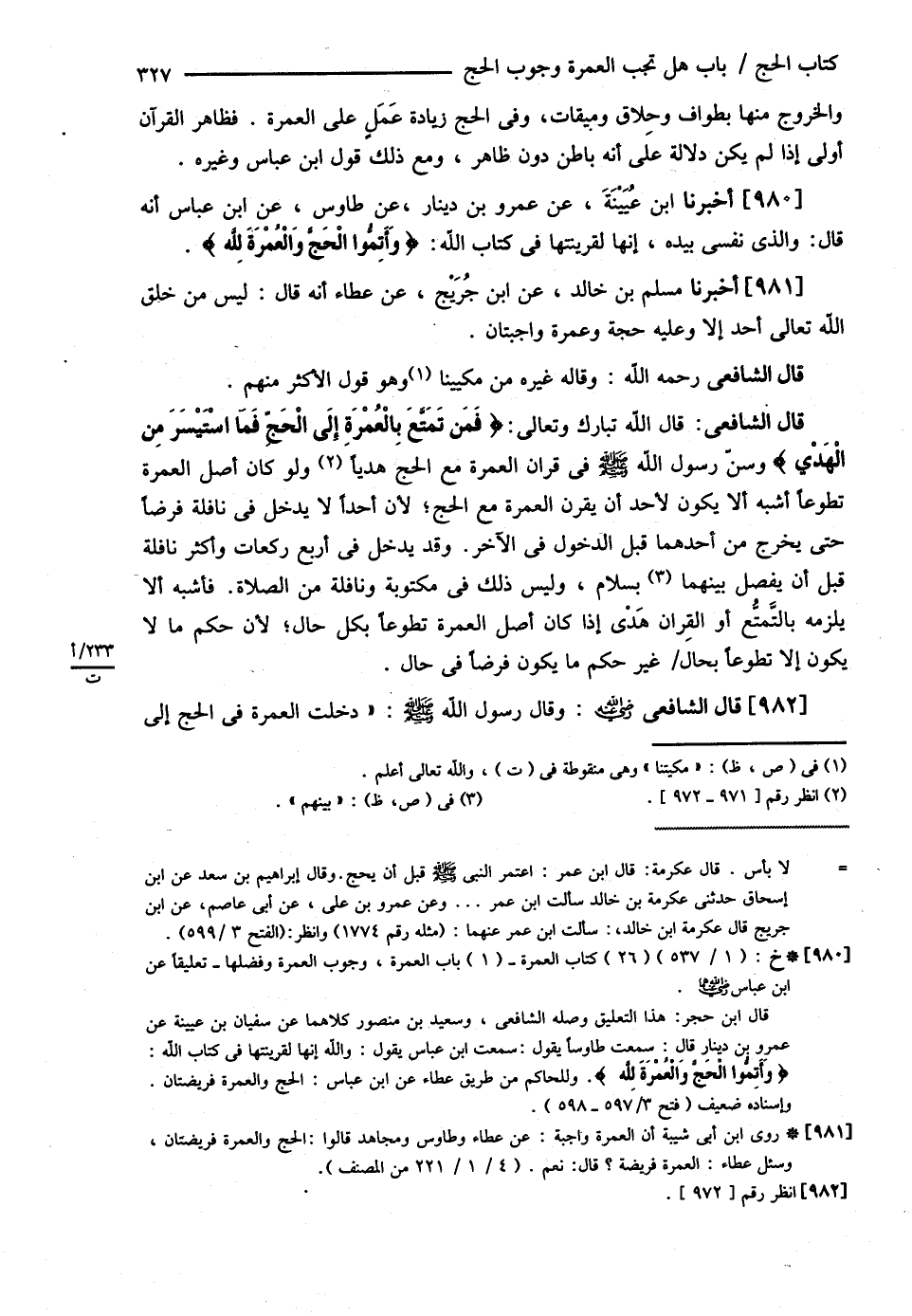قَالَ الشَّافِعِيُّ : وَاَلَّذِي هُوَ أَشْبَهُ بِظَاهِرِ الْقُرْآنِ وَأَوْلَى بِأَهْلِ الْعِلْمِ عِنْدِي وَأَسْأَلُ اللَّهَ التَّوْفِيقَ أَنْ تَكُونَ الْعُمْرَةُ وَاجِبَةً , فَإِنَّ اللَّهَ عَزَّ وَجَلَّ قَرَنَهَا مَعَ الْحَجِّ فَقَالَ { وَأَتِمُّوا الْحَجَّ وَالْعُمْرَةَ لِلَّهِ فَإِنْ أُحْصِرْتُمْ فَمَا اسْتَيْسَرَ مِنْ الْهَدْيِ } { وَأَنَّ رَسُولَ اللَّهِ - صلى الله عليه وسلم - اعْتَمَرَ قَبْلَ أَنْ يَحُجَّ } وَأَنَّ رَسُولَ اللَّهِ - صلى الله عليه وسلم - سَنَّ إحْرَامَهَا@