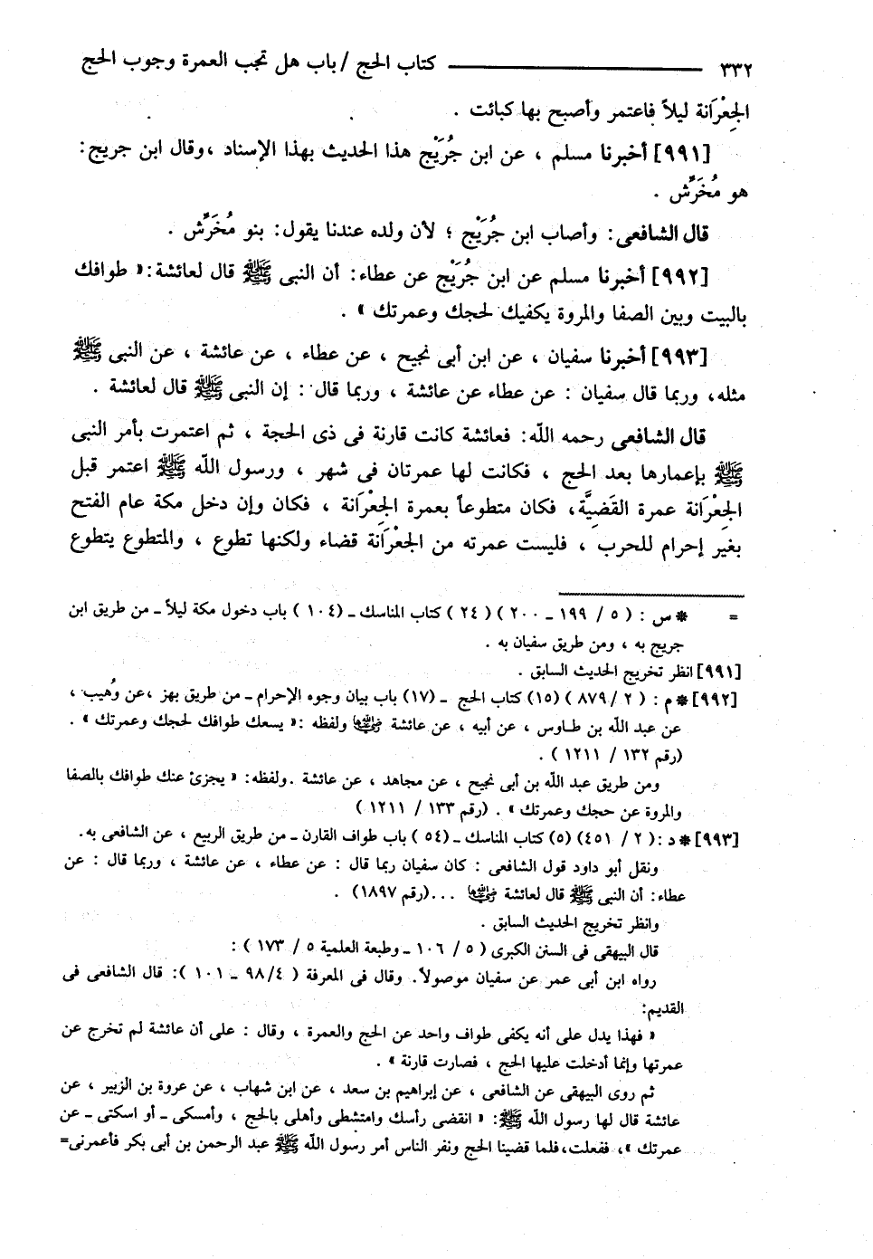 , أَخْبَرَنَا ابْنُ عُيَيْنَةَ أَنَّهُ سَمِعَ عَمْرَو بْنَ دِينَارٍ يَقُولُ سَمِعْت عَمْرَو بْنَ أَوْسٍ الثَّقَفِيَّ يَقُولُ أَخْبَرَنِي { عَبْدُ الرَّحْمَنِ بْنُ أَبِي بَكْرٍ أَنَّ النَّبِيَّ - صلى الله عليه وسلم - أَمَرَهُ أَنْ يُرْدِفَ عَائِشَةَ فَيُعْمِرَهَا مِنْ التَّنْعِيمِ قَالَ الشَّافِعِيُّ وَعَائِشَةُ كَانَتْ قَارِنَةً فَقَضَتْ الْحَجَّ وَالْعُمْرَةَ الْوَاجِبَتَيْنِ عَلَيْهَا , وَأَحَبَّتْ أَنْ تَنْصَرِفَ بِعُمْرَةٍ غَيْرِ مَقْرُونَةٍ بِحَجٍّ , فَسَأَلَتْ ذَلِكَ النَّبِيَّ - صلى الله عليه وسلم - فَأَمَرَ بِإِعْمَارِهَا , فَكَانَتْ لَهَا نَافِلَةً خَيْرًا , وَقَدْ كَانَتْ دَخَلَتْ مَكَّةَ بِإِحْرَامٍ , فَلَمْ يَكُنْ عَلَيْهَا رُجُوعٌ إلَى الْمِيقَاتِ , } أَخْبَرَنَا سُفْيَانُ بْنُ عُيَيْنَةَ عَنْ إسْمَاعِيلَ بْنِ أُمَيَّةَ عَنْ مُزَاحِمٍ عَنْ عَبْدِ الْعَزِيزِ بْنِ عَبْدِ اللَّهِ بْنِ خَالِدٍ عَنْ مُحَرِّشٍ الْكَعْبِيِّ أَوْ مُحَرِّشٍ { أَنَّ النَّبِيَّ - صلى الله عليه وسلم - خَرَجَ مِنْ @