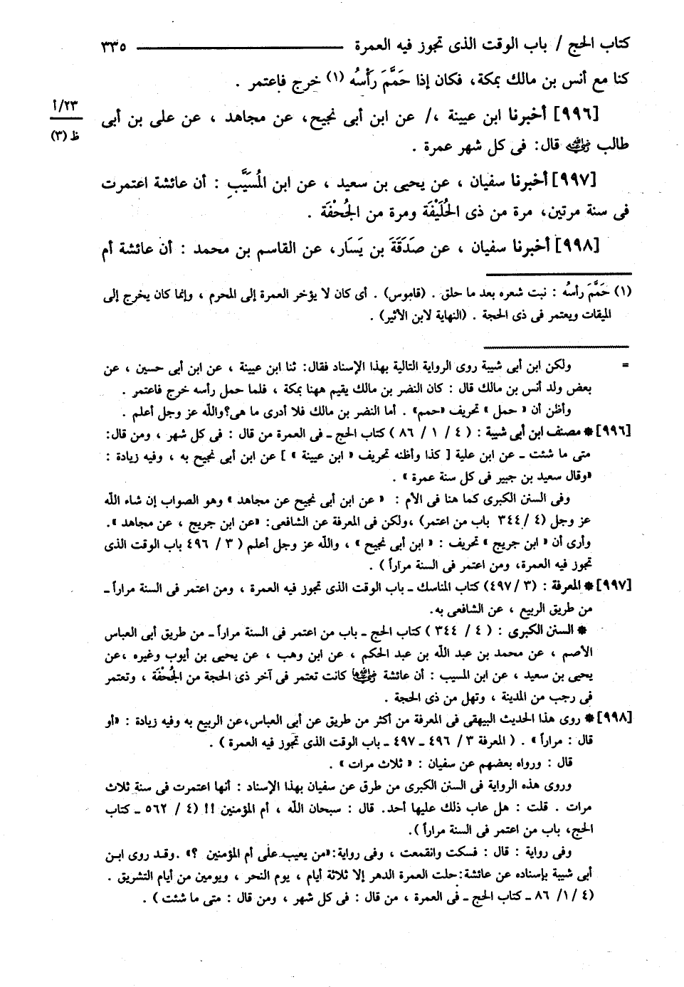قَالَ الشَّافِعِيُّ : وَالْعُمْرَةُ فِي السَّنَةِ كُلِّهَا فَلاَ بَأْسَ بِأَنْ يَعْتَمِرَ الرَّجُلُ فِي السَّنَةِ مِرَارًا , وَهَذَا قَوْلُ الْعَامَّةِ مِنْ الْمَكِّيِّينَ وَأَهْلِ الْبُلْدَانِ , غَيْرَ أَنَّ قَائِلاً مِنْ الْحِجَازِيِّينَ كَرِهَ الْعُمْرَةَ فِي السَّنَةِ إلَّا مَرَّةً وَاحِدَةً , وَإِذَا كَانَتْ الْعُمْرَةُ تَصْلُحُ فِي كُلِّ شَهْرٍ فَلاَ تُشْبِهُ الْحَجَّ الَّذِي لاَ يَصْلُحُ إلَّا فِي يَوْمٍ مِنْ شَهْرٍ بِعَيْنِهِ إنْ لَمْ يُدْرِكْ فِيهِ الْحَجَّ فَاتَ إلَى قَابِلٍ فَلاَ يَجُوزُ أَنْ تُقَاسَ عَلَيْهِ وَهِيَ تُخَالِفُهُ فِي هَذَا كُلِّهِ , فَإِنْ قَالَ قَائِلٌ : مَا دَلَّ عَلَى مَا وَصَفْت ؟ قِيلَ لَهُ عَائِشَةُ مِمَّنْ لَمْ يَكُنْ مَعَهُ هَدْيٌ وَمِمَّنْ دَخَلَ فِي أَمْرِ النَّبِيِّ - صلى الله عليه وسلم - أَنْ يَكُونَ إحْرَامُهُ عُمْرَةً فَعَرِكَتْ فَلَمْ تَقْدِرْ عَلَى الطَّوَافِ لِلطَّمْثِ فَأَمَرَهَا رَسُولُ اللَّهِ - صلى الله عليه وسلم - أَنْ تُهِلَّ بِالْحَجِّ فَكَانَتْ قَارِنَةً وَكَانَتْ عُمْرَتُهَا فِي ذِي الْحِجَّةِ ثُمَّ سَأَلَتْهُ أَنْ يُعْمِرَهَا فَأَعْمَرَهَا فِي ذِي الْحِجَّةِ فَكَانَتْ هَذِهِ عُمْرَتَيْنِ فِي شَهْرٍ فَكَيْفَ يُنْكِرُ أَحَدٌ بَعْدَ أَمْرِ النَّبِيِّ - صلى الله عليه وسلم - بِعُمْرَتَيْنِ فِي شَهْرٍ يَزْعُمُ أَنْ لاَ تَكُونَ فِي السَّنَةِ إلَّا مَرَّةً ؟ أَخْبَرَنَا ابْنُ عُيَيْنَةَ عَنْ ابْنِ أَبِي حُسَيْنٍ عَنْ بَعْضِ وَلَدِ أَنَسِ بْنِ مَالِكٍ قَالَ @