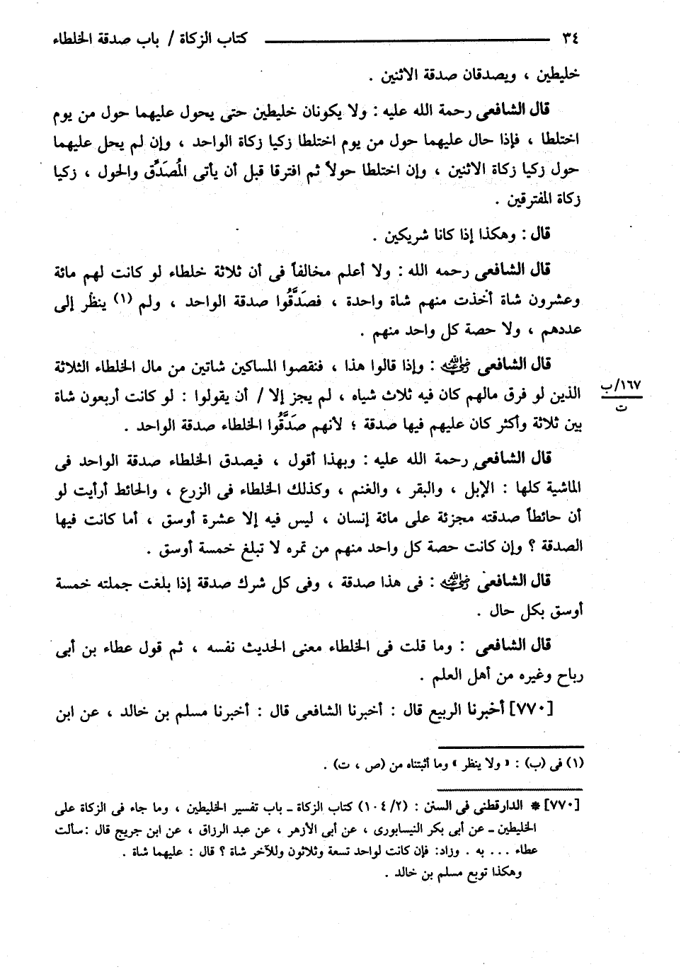 قَالَ الشَّافِعِيُّ : وَاَلَّذِي لاَ أَشُكُّ فِيهِ أَنَّ الْخَلِيطَيْنِ الشَّرِيكَانِ لَمْ يُقَسِّمَا الْمَاشِيَةَ , وَتَرَاجُعُهُمَا بِالسَّوِيَّةِ أَنْ يَكُونَا خَلِيطَيْنِ فِي الْإِبِلِ فِيهَا الْغَنَمُ تُوجَدُ الْإِبِلُ فِي يَدِ أَحَدِهِمَا فَتُؤْخَذُ فِي صَدَقَتِهَا فَيَرْجِعُ عَلَى شَرِيكِهِ بِالسَّوِيَّةِ