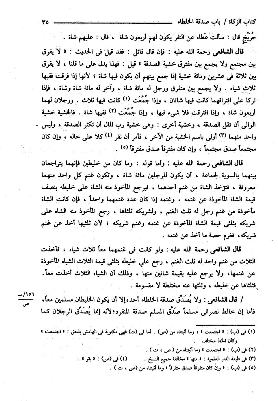 قَالَ الشَّافِعِيُّ : وَلاَ أَعْلَمُ مُخَالِفًا فِي أَنَّ ثَلاَثَةَ خُلَطَاءَ لَوْ كَانَتْ لَهُمْ مِائَةٌ وَعِشْرُونَ شَاةً أُخِذَتْ مِنْهُمْ شَاةٌ وَاحِدَةٌ فَصَدَّقُوا صَدَقَةَ الْوَاحِدِ وَلاَ يُنْظَرُ إلَى عَدَدِهِمْ وَلاَ حِصَّةِ كُلِّ وَاحِدٍ مِنْهُمْ