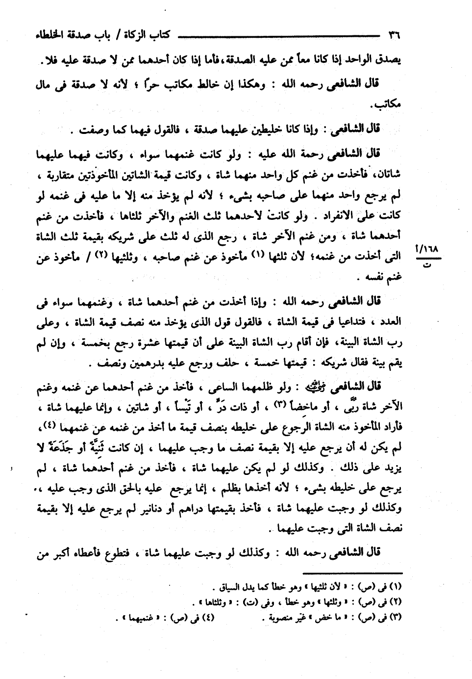 قَالَ الشَّافِعِيُّ : وَلَوْ كَانَتْ فِي غَنَمِهِمَا مَعًا ثَلاَثُ شِيَاهٍ فَأُخِذَتْ الثَّلاَثُ مِنْ غَنَمِ وَاحِدٍ لَهُ ثُلُثُ الْغَنَمِ رَجَعَ عَلَى خَلِيطِهِ بِثُلُثَيْ قِيمَةِ الثَّلاَثِ الشِّيَاهِ الْمَأْخُوذَةِ عَنْ غَنَمِهَا وَلاَ يَرْجِعُ عَلَيْهِ بِقِيمَةِ شَاتَيْنِ مِنْهَا , وَذَلِكَ أَنَّ الشِّيَاهَ الثَّلاَثَ أُخِذَتْ مَعًا فَثُلُثَاهَا عَنْ خَلِيطِهِ وَثُلُثُهَا عَنْهُ مُخْتَلِطَةً لاَ مَقْسُومَةً