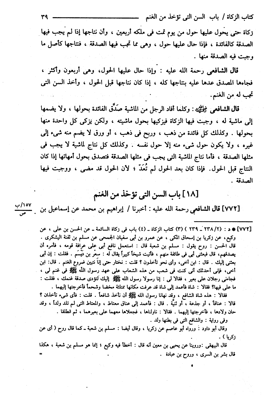 قَالَ الشَّافِعِيُّ : جُمْلَةُ جِمَاعِ مَا أَحْفَظُ عَنْ عَدَدٍ لَقِيت وَأَقُولُ بِهِ أَنَّ الرَّجُلَ لاَ يَكُونُ عَلَيْهِ فِي مَاشِيَتِهِ صَدَقَةٌ حَتَّى يَمْلِكَ أَرْبَعِينَ شَاةً فِي أَوَّلِ السَّنَةِ وَآخِرِهَا وَيَحُولُ عَلَيْهَا حَوْلٌ فِي يَدِهِ , فَإِنْ كَانَتْ أَقَلَّ مِنْ أَرْبَعِينَ شَاةً فِي أَوَّلِ الْحَوْلِ ثُمَّ نَتَجَتْ فَصَارَتْ أَرْبَعِينَ لَمْ يَجِبْ عَلَيْهِ فِيهَا صَدَقَةٌ حَتَّى يَحُولَ عَلَيْهِ فِيهَا حَوْلٌ مِنْ يَوْمِ صَارَتْ أَرْبَعِينَ , وَكَذَلِكَ لَوْ كَانَتْ أَقَلَّ مِنْ أَرْبَعِينَ شَاةً ثُمَّ أَفَادَ إلَيْهَا تَمَامَ أَرْبَعِينَ لَمْ يَكُنْ فِيهَا@