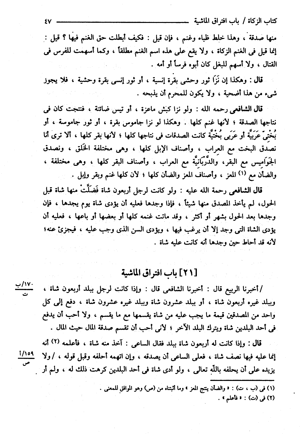 قال : وَهَذَا هَكَذَا فِي الْبَقَرِ , وَالْإِبِلِ الَّتِي فَرِيضَتُهَا مِنْهَا , وَفِي الْإِبِلِ الَّتِي فَرِيضَتُهَا مِنْ الْغَنَمِ قَوْلاَنِ أَحَدُهُمَا أَنَّهَا هَكَذَا ; لِأَنَّ الشَّاةَ الَّتِي فِيهَا فِي رِقَابِهَا يُبَاعُ مِنْهَا بَعِيرٌ فَيُؤْخَذُ مِنْهَا إنْ لَمْ يَأْتِ بِهَا رَبُّهَا , وَهَذَا أَشْبَهُ الْقَوْلَيْنِ , وَالثَّانِي أَنَّ فِي كُلِّ خَمْسٍ مِنْ الْإِبِلِ حَالَ عَلَيْهَا ثَلاَثَةُ أَحْوَالٍ ثَلاَثُ شِيَاهٍ فِي كُلِّ حَوْلٍ شَاةٌ
