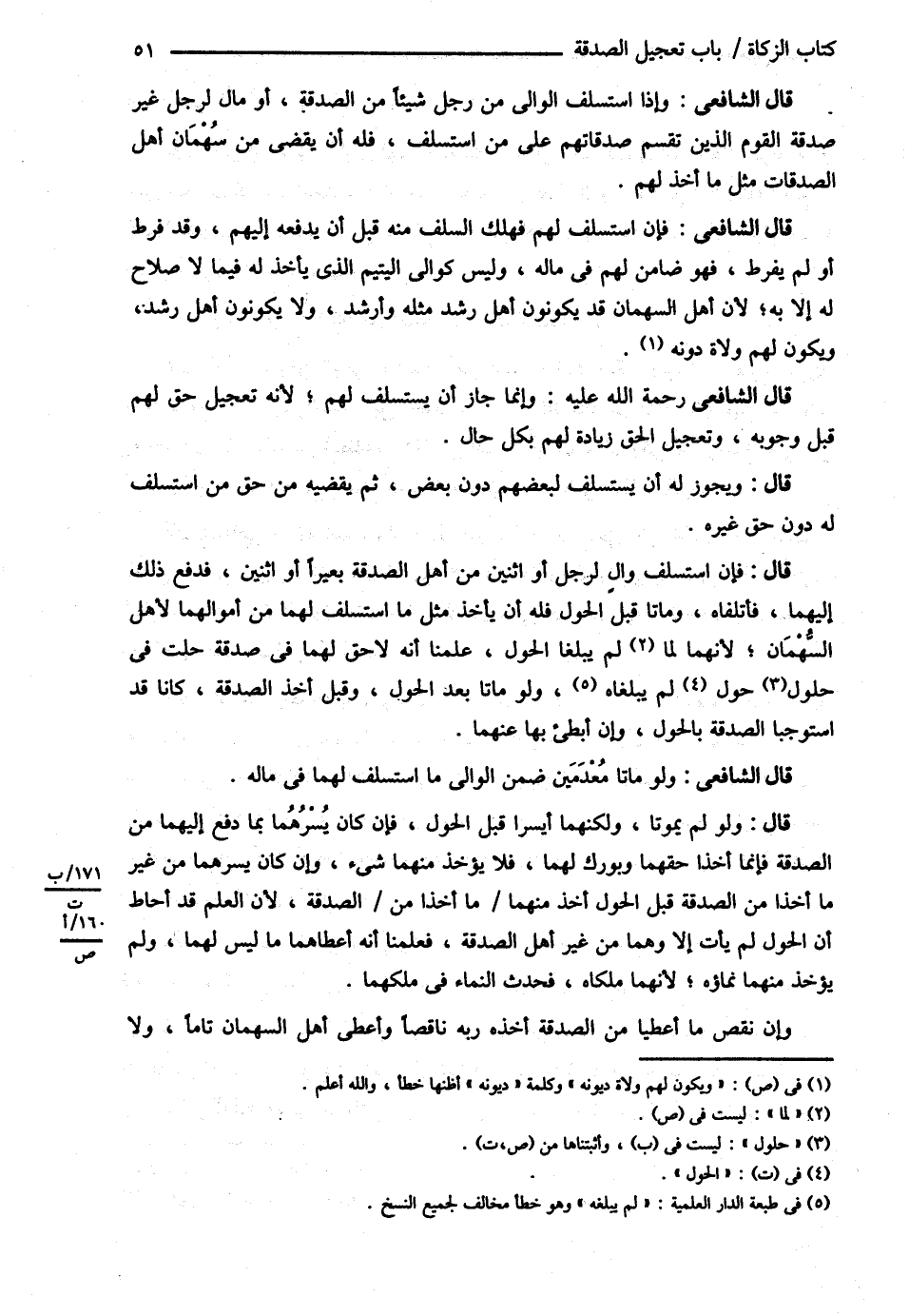 قَالَ الشَّافِعِيُّ : وَيَجُوزُ لِلْوَالِي إذَا رَأَى الْخُلَّةَ فِي أَهْلِ الصَّدَقَةِ أَنْ يَسْتَسْلِفَ لَهُمْ مِنْ صَدَقَاتِ أَهْلِ الْأَمْوَالِ إذَا طَابُوا بِهَا نَفْسًا وَلاَ يُجْبَرُ رَبُّ مَالٍ عَلَى أَنْ يُخْرِجَ صَدَقَتَهُ قَبْلَ مَحِلِّهَا إلَّا أَنْ يَتَطَوَّعَ@