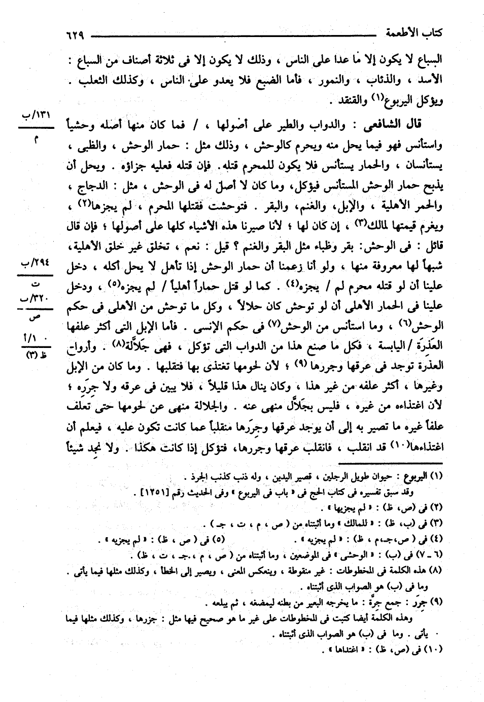 اللَّذَانِ لَمْ يَكُونَا قَطُّ إلَّا نَجِسَيْنِ أَوْلَى أَنْ يَحْرُمَا أَنْ يُؤْكَلاَ أَوْ يُشْرَبَا . وَإِذَا كَانَ هَذَا هَكَذَا فَفِيهِ كِفَايَةٌ مَعَ أَنَّ ثَمَّ دَلاَلَةٌ بِسُنَّةِ رَسُولِ اللَّهِ - صلى الله عليه وسلم - فَلَمَّا أَمَرَ رَسُولُ اللَّهِ - صلى الله عليه وسلم - بِقَتْلِ الْغُرَابِ وَالْحِدَأَةِ وَالْعَقْرَبِ وَالْفَأْرَةِ وَالْكَلْبِ الْعَقُورِ دَلَّ هَذَا عَلَى تَحْرِيمِ أَكْلِ مَا أَمَرَ بِقَتْلِهِ فِي الْإِحْرَامِ وَلَمَّا كَانَ هَذَا مِنْ الطَّائِرِ وَالدَّوَابِّ كَمَا وَصَفْت دَلَّ هَذَا عَلَى أَنْ أَنْظُرَ إلَى كُلِّ مَا كَانَتْ الْعَرَبُ تَأْكُلُهُ فَيَكُونُ حَلاَلاً وَإِلَى مَا لَمْ تَكُنْ الْعَرَبُ تَأْكُلُهُ فَيَكُونُ حَرَامًا فَلَمْ تَكُنْ الْعَرَبُ تَأْكُلُ كَلْبًا وَلاَ ذِئْبًا وَلاَ أَسَدًا وَلاَ نَمِرًا وَتَأْكُلُ الضَّبُعَ فَالضَّبُعُ حَلاَلٌ وَيُجْزِيهَا الْمُحَرَّمُ بِخَبَرٍ عَنْ النَّبِيِّ - صلى الله عليه وسلم - أَنَّهَا صَيْدٌ وَتُؤْكَلُ , وَلَمْ تَأْكُلْ الْفَأْرَ وَلاَ الْعَقَارِبَ وَلاَ الْحَيَّاتِ وَلاَ الْحِدَأَ وَلاَ الْغِرْبَانَ فَجَاءَتْ السُّنَّةُ مُوَافِقَةً لِلْقُرْآنِ بِتَحْرِيمِ مَا حَرَّمُوا وَإِحْلاَلِ مَا أَحَلُّوا وَإِبَاحَةِ أَنْ يُقْتَلَ فِي الْإِحْرَامِ مَا كَانَ غَيْرَ حَلاَلٍ أَنْ يُؤْكَلَ ثُمَّ هَذَا أَصْلُهُ , فَلاَ يَجُوزُ أَنْ يُؤْكَلَ الرَّخَمُ وَلاَ الْبُغَاثُ وَلاَ الصُّقُورُ وَلاَ الصَّوَائِدُ مِنْ الطَّائِرِ كُلِّهِ مِثْلُ الشَّوَاهِينِ وَالْبُزَاةِ وَالْبَوَاشِقِ وَلاَ تُؤْكَلُ الْخَنَافِسُ وَلاَ الْجُعْلاَن وَلاَ الْعَظَاءُ وَلاَ اللُّحَكَاءُ وَلاَ الْعَنْكَبُوتُ وَلاَ الزَّنَابِيرُ وَلاَ كُلُّ مَا كَانَتْ الْعَرَبُ لاَ تَأْكُلُهُ . وَيُؤْكَلُ الضَّبُّ وَالْأَرْنَبُ وَالْوَبْرُ وَحِمَارُ الْوَحْشِ وَكُلُّ مَا أَكَلَتْهُ الْعَرَبُ أَوْ فَدَاهُ الْمُحْرِمُ فِي سُنَّةٍ أَوْ أَثَرٍ , وَتُؤْكَلُ الضَّبُعُ وَالثَّعْلَبُ