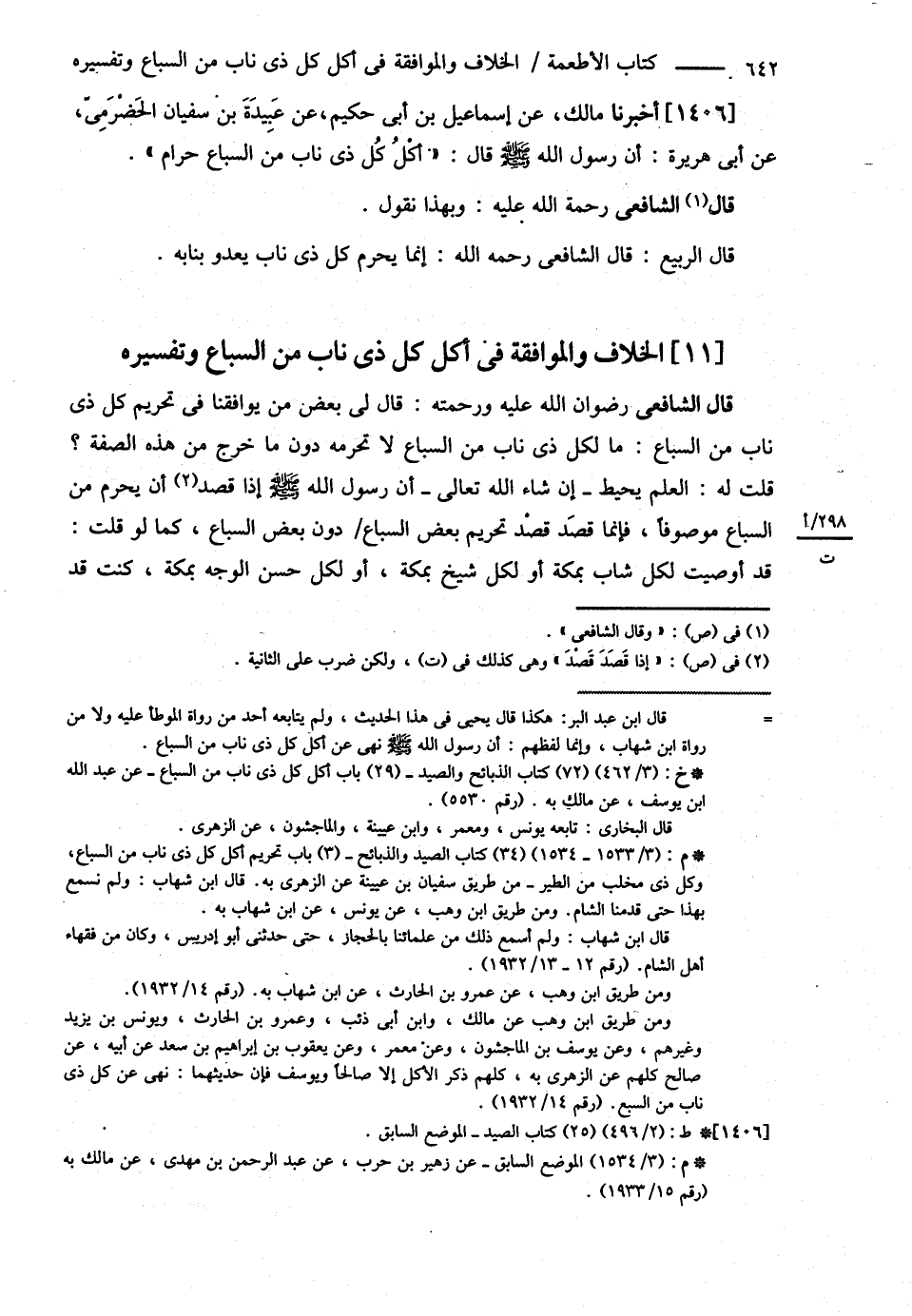 تَحْرِيمُ أَكْلِ كُلِّ ذِي نَابٍ مِنْ السِّبَاعِ قَالَ الرَّبِيعُ أَخْبَرَنَا الشَّافِعِيُّ قَالَ : أَخْبَرَنَا سُفْيَانُ بْنُ عُيَيْنَةَ عَنْ الزُّهْرِيِّ , وَمَالِكٍ عَنْ ابْنِ شِهَابٍ عَنْ أَبِي إدْرِيسَ عَنْ أَبِي ثَعْلَبَةَ { أَنَّ النَّبِيَّ - صلى الله عليه وسلم - نَهَى عَنْ أَكْلِ كُلِّ ذِي نَابٍ مِنْ السِّبَاعِ } .@