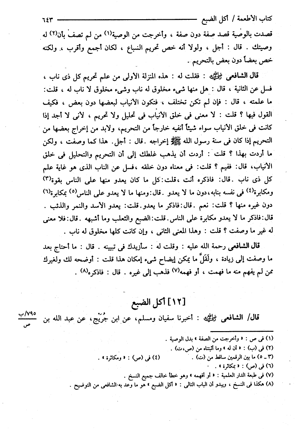 قَالَ الشَّافِعِيُّ : رحمه الله قَالَ لِي بَعْضُ مَنْ يُوَافِقُنَا فِي تَحْرِيمِ كُلِّ ذِي نَابٍ مِنْ السِّبَاعِ مَا لِكُلِّ ذِي نَابٍ مِنْ السِّبَاعِ لاَ تُحَرِّمُهُ دُونَ مَا خَرَجَ مِنْ هَذِهِ الصِّفَةِ ؟ قُلْت لَهُ الْعِلْمُ يُحِيطُ إنْ شَاءَ اللَّهُ تَعَالَى أَنَّ رَسُولَ اللَّهِ - صلى الله عليه وسلم - إذَا قَصَدَ قَصَدَ أَنْ يُحَرِّمَ مِنْ السِّبَاعِ مَوْصُوفًا . فَإِنَّمَا قَصَدَ قَصْدَ تَحْرِيمِ بَعْضِ السِّبَاعِ دُونَ بَعْضِ السِّبَاعِ , كَمَا لَوْ قُلْت قَدْ أَوْصَيْت لِكُلِّ شَابٍّ بِمَكَّةَ أَوْ لِكُلِّ شَيْخٍ بِمَكَّةَ . أَوْ لِكُلِّ حَسَنِ الْوَجْهِ بِمَكَّةَ , كُنْت قَدْ@
