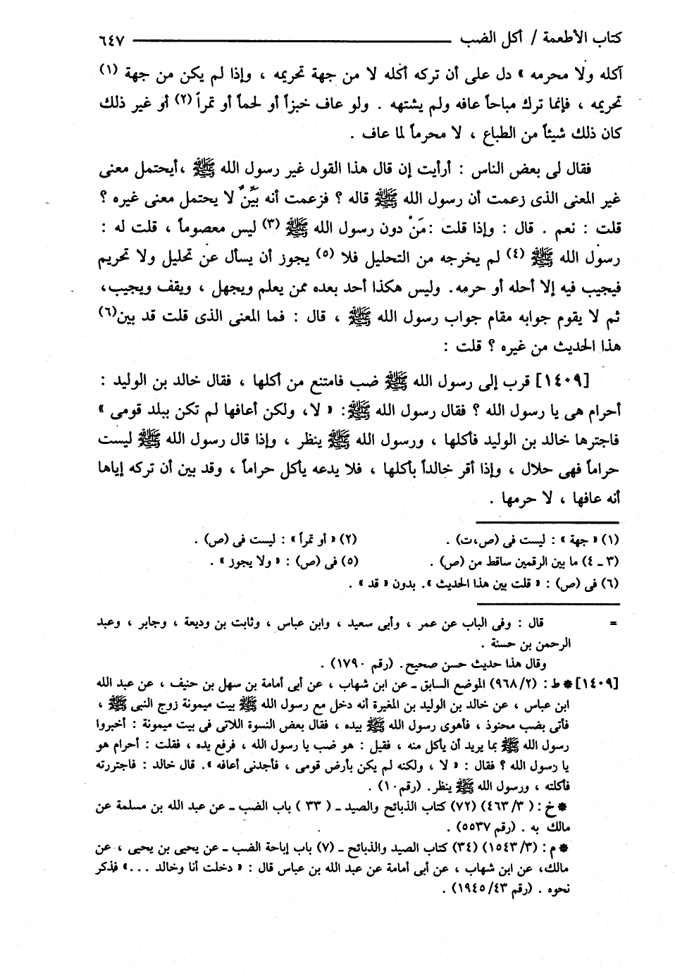 قَالَ الشَّافِعِيُّ : رحمه الله : وَلاَ بَأْسَ بِأَكْلِ الضَّبِّ , صَغِيرًا أَوْ كَبِيرًا , فَإِنْ قَالَ قَائِلٌ : قَدْ رَوَيْتُمْ { عَنْ النَّبِيِّ - صلى الله عليه وسلم - أَنَّهُ سُئِلَ عَنْ الضَّبِّ فَقَالَ لَسْت آكُلُهُ وَلاَ مُحَرِّمُهُ } قِيلَ لَهُ إنْ شَاءَ اللَّهُ فَهُوَ لَمْ يَرْوِ عَنْ رَسُولِ اللَّهِ - صلى الله عليه وسلم - فِي الضَّبِّ شَيْئًا غَيْرَ هَذَا , وَتَحْلِيلُهُ أَكْلَهُ بَيْنَ يَدَيْهِ ثَابِتٌ . فَإِنْ قَالَ قَائِلٌ : فَأَيْنَ ذَلِكَ ؟ قِيلَ : لَمَّا قَالَ : { لَسْت @